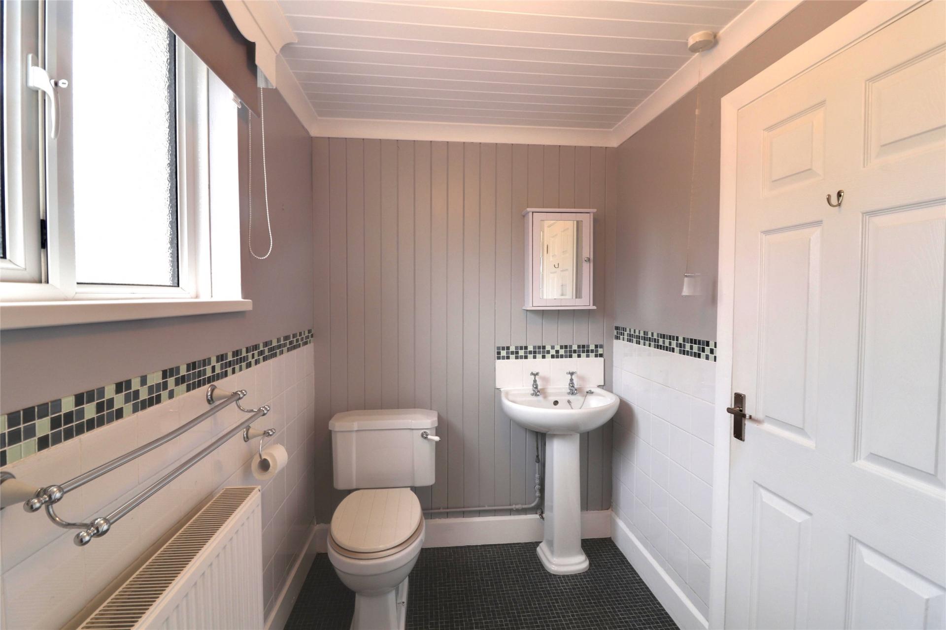 The kitchen is well-equipped with matching wall and base units, an inset stainless steel sink, space and plumbing for under-counter white goods, and room for a freestanding cooker. A practical breakfast bar adds extra functionality for casual dining or meal prep. From the kitchen, a secondary hallway provides access to the rear garden and leads to the family bathroom, which comprises a panelled bath with electric shower over, WC, and hand wash basin.