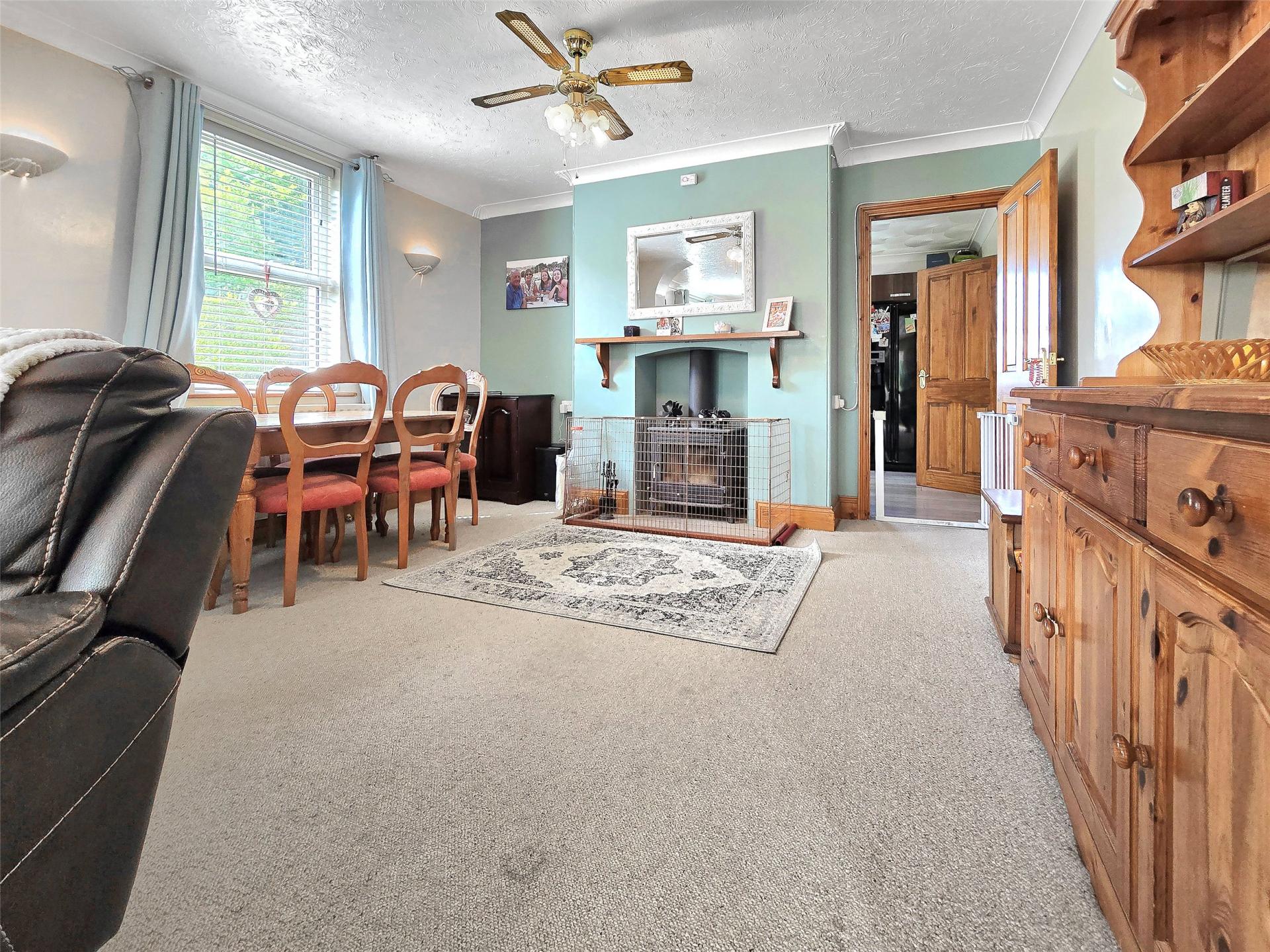 The ground floor comprises a welcoming entrance hall, a spacious dual-aspect lounge/diner with feature woodburning stove, and sliding patio doors opening into a uPVC double glazed conservatory that enjoys a pleasant outlook over the south-facing rear garden.