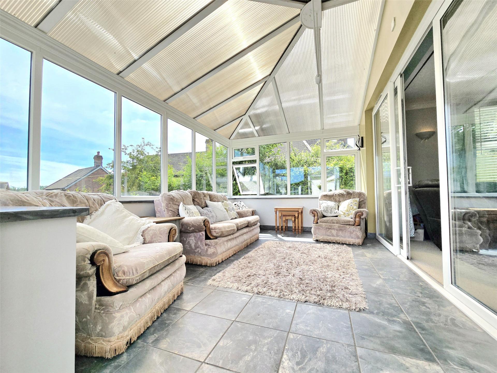 The attractive rear garden is south-facing and predominantly laid to lawn, with two seating areas ideal for outdoor dining and entertaining. Raised beds and borders provide seasonal colour, and additional lawn space extends to the side.
