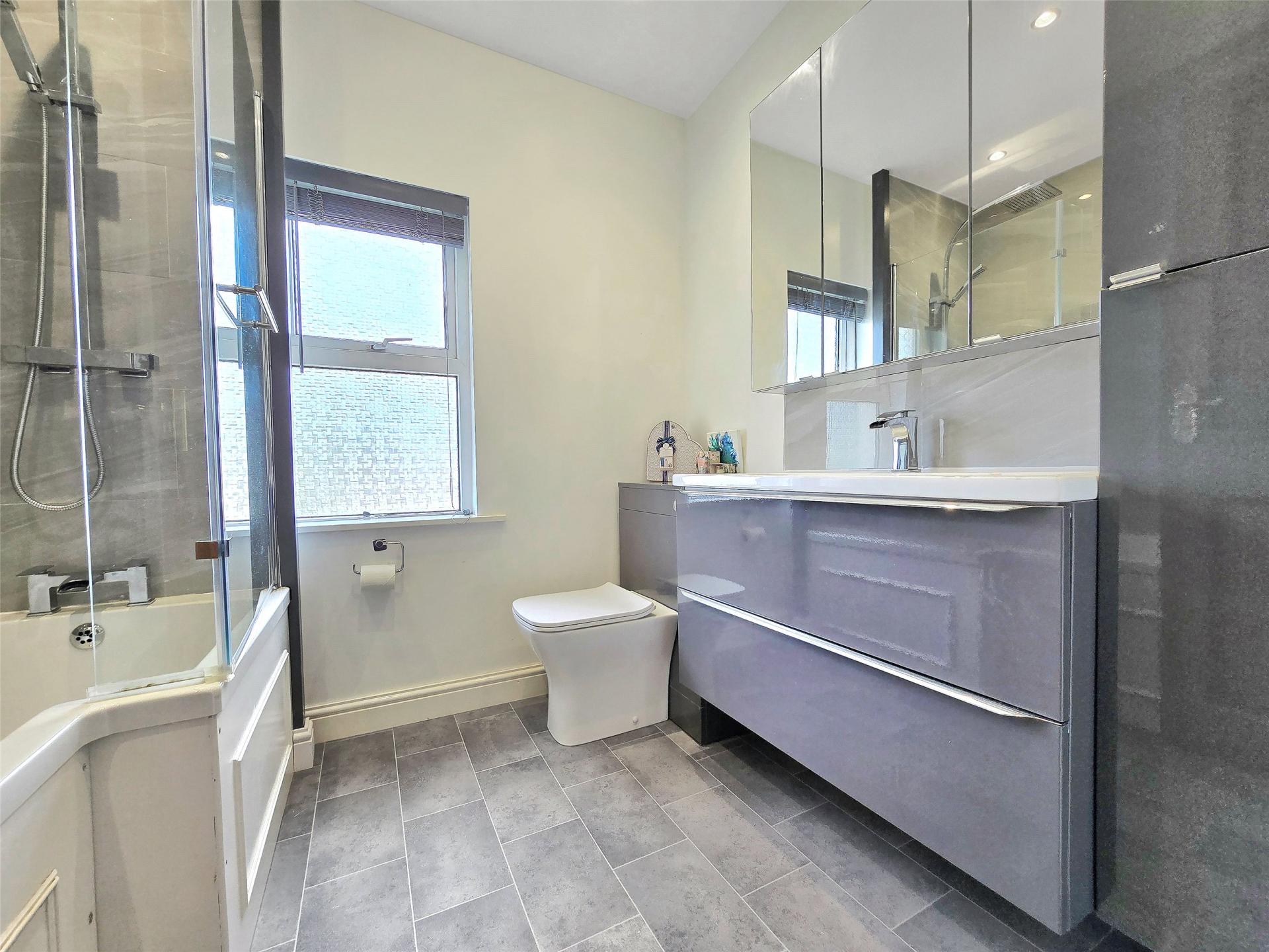 The family bathroom includes a white suite with shower over the bath, complemented by contemporary built-in storage.