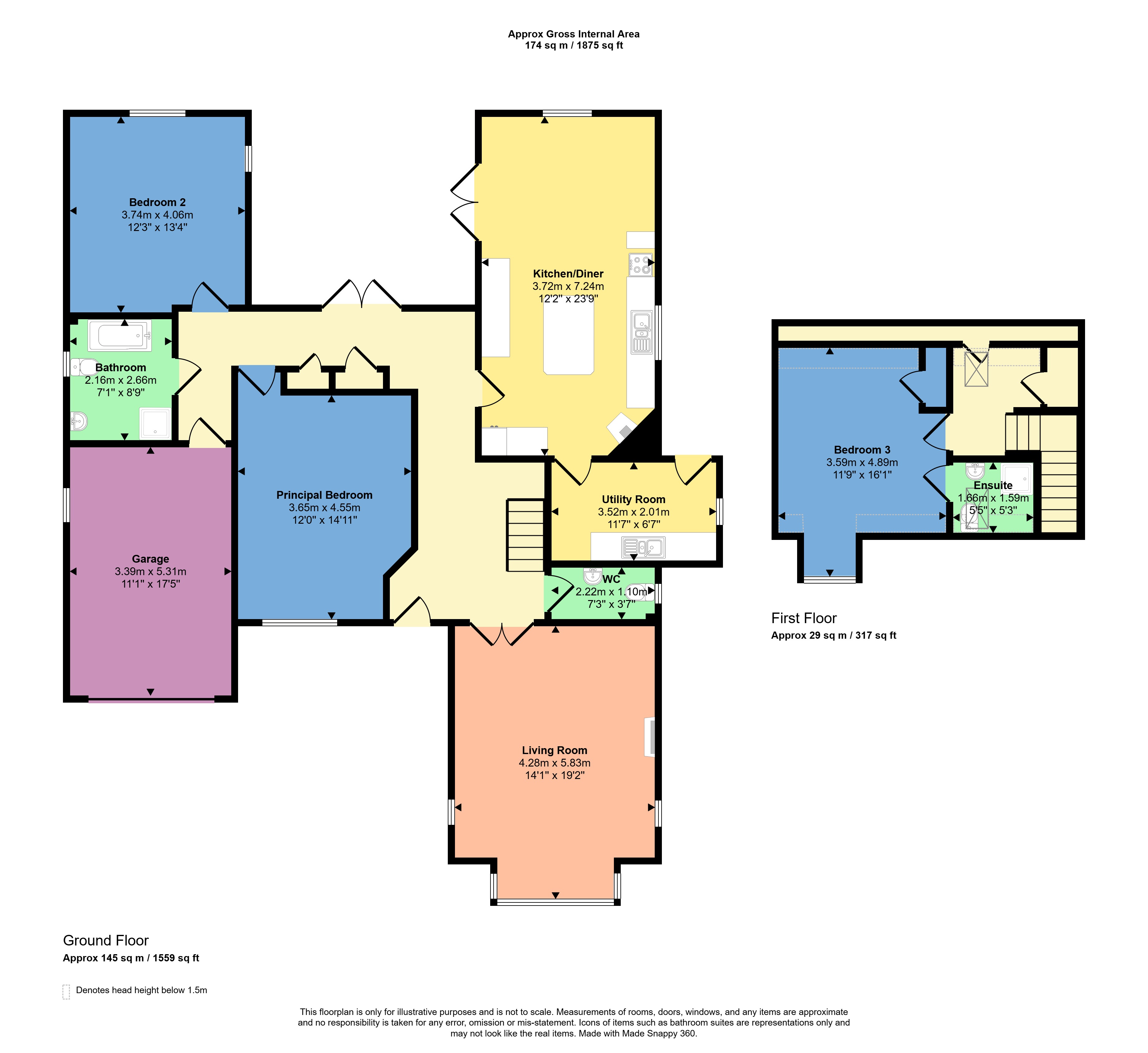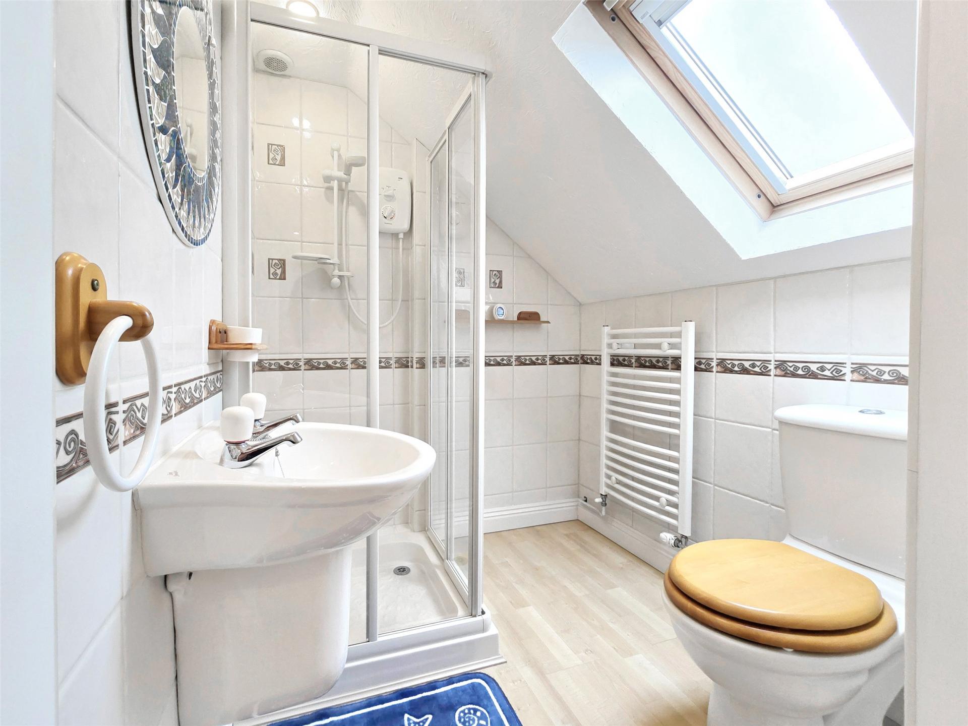There are two double bedrooms on the ground floor, serviced by a family bathroom with bath, corner shower, hand basin, and WC. Upstairs, a further double bedroom boasts an ensuite shower room.
