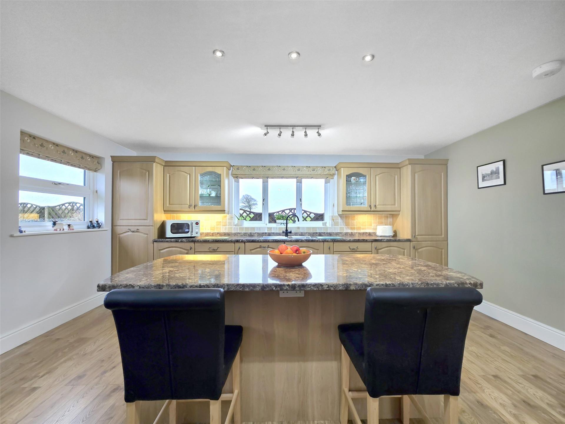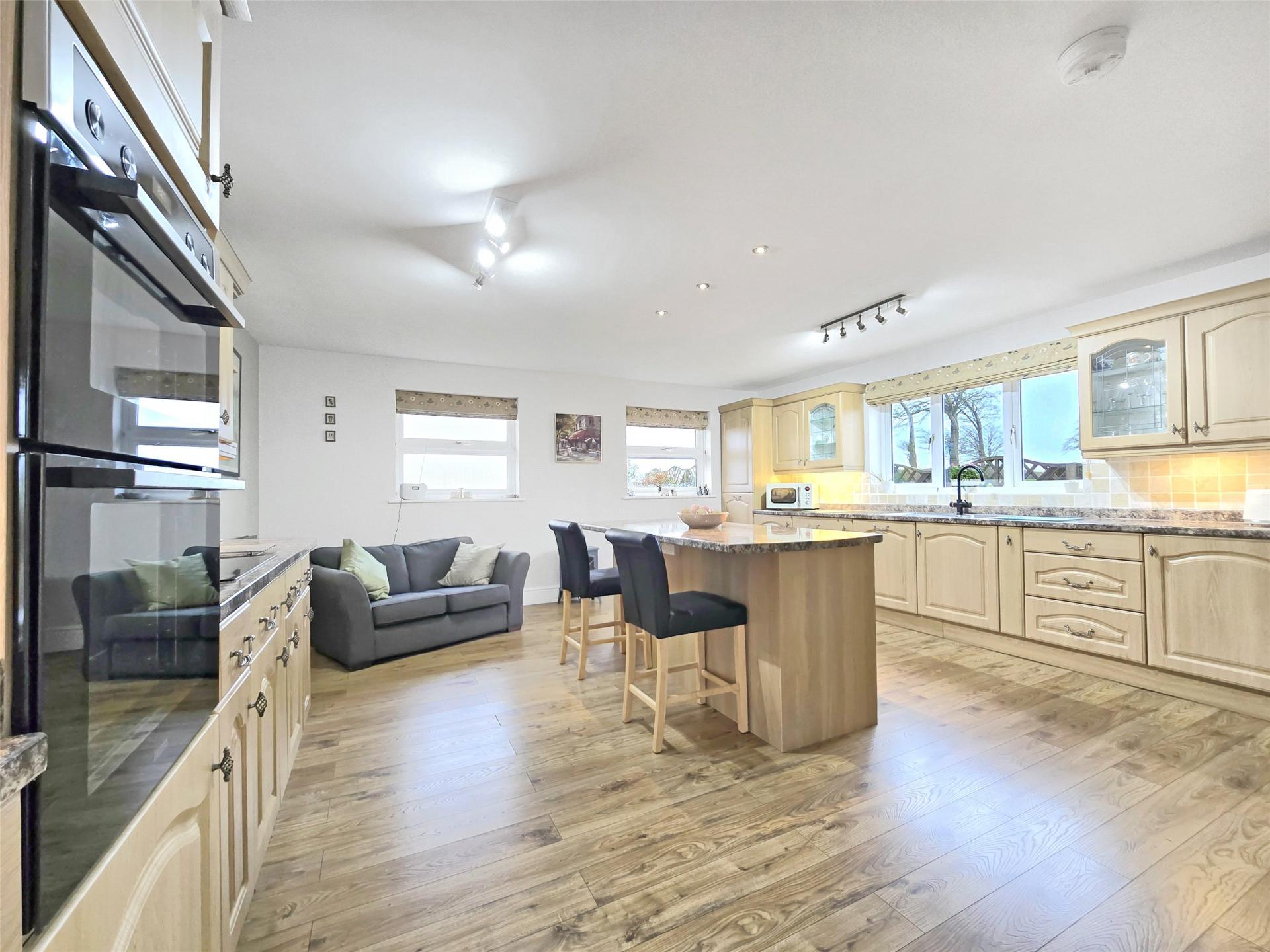 The well-appointed kitchen is a true heart of the home, featuring a central island with breakfast bar, extensive base and wall-mounted storage, and a full range of integral appliances including induction hob, double oven, dishwasher, fridge, freezer, and a Hanstrom boiling water tap.