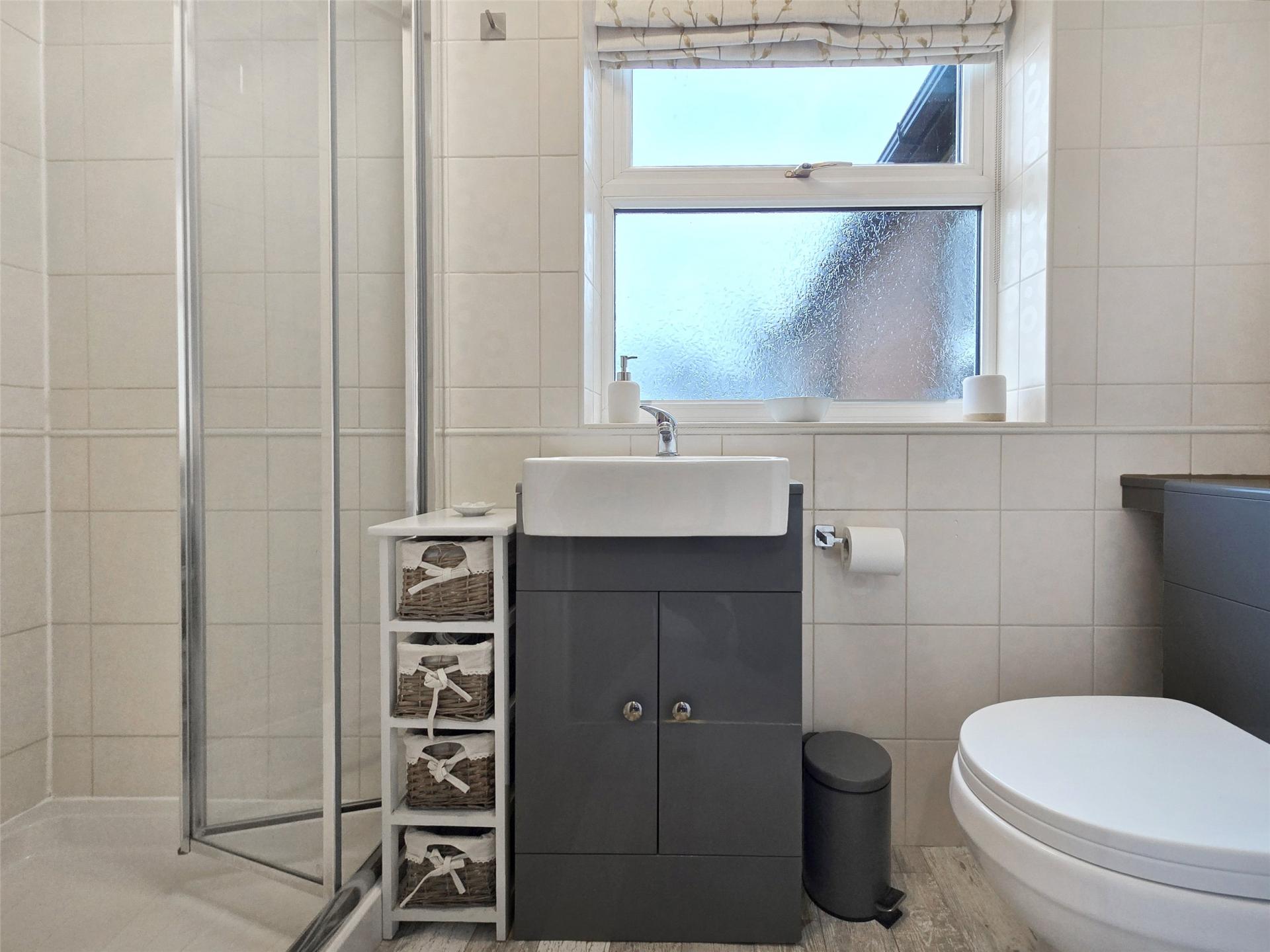 Upstairs, a bright and spacious landing leads to three double bedrooms, including a principal suite with a modern ensuite shower, hand basin with vanity storage, and WC.