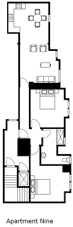 Apartment 9 is located on the third (top) floor and has bright and airy, spacious rooms. The accommodation comprises a delightful open plan living/dining room and kitchen, 2 double-sized bedrooms and a well-appointed bathroom.