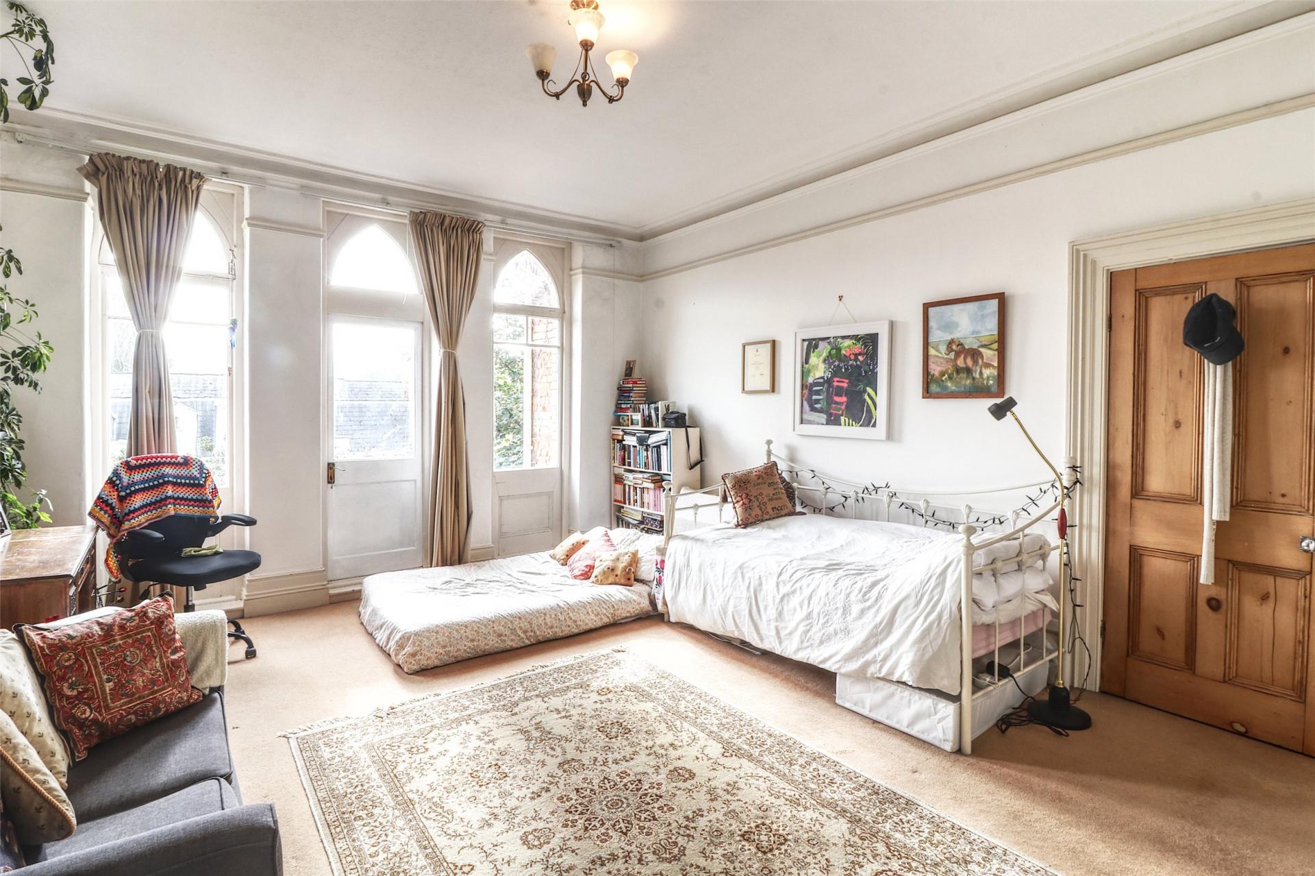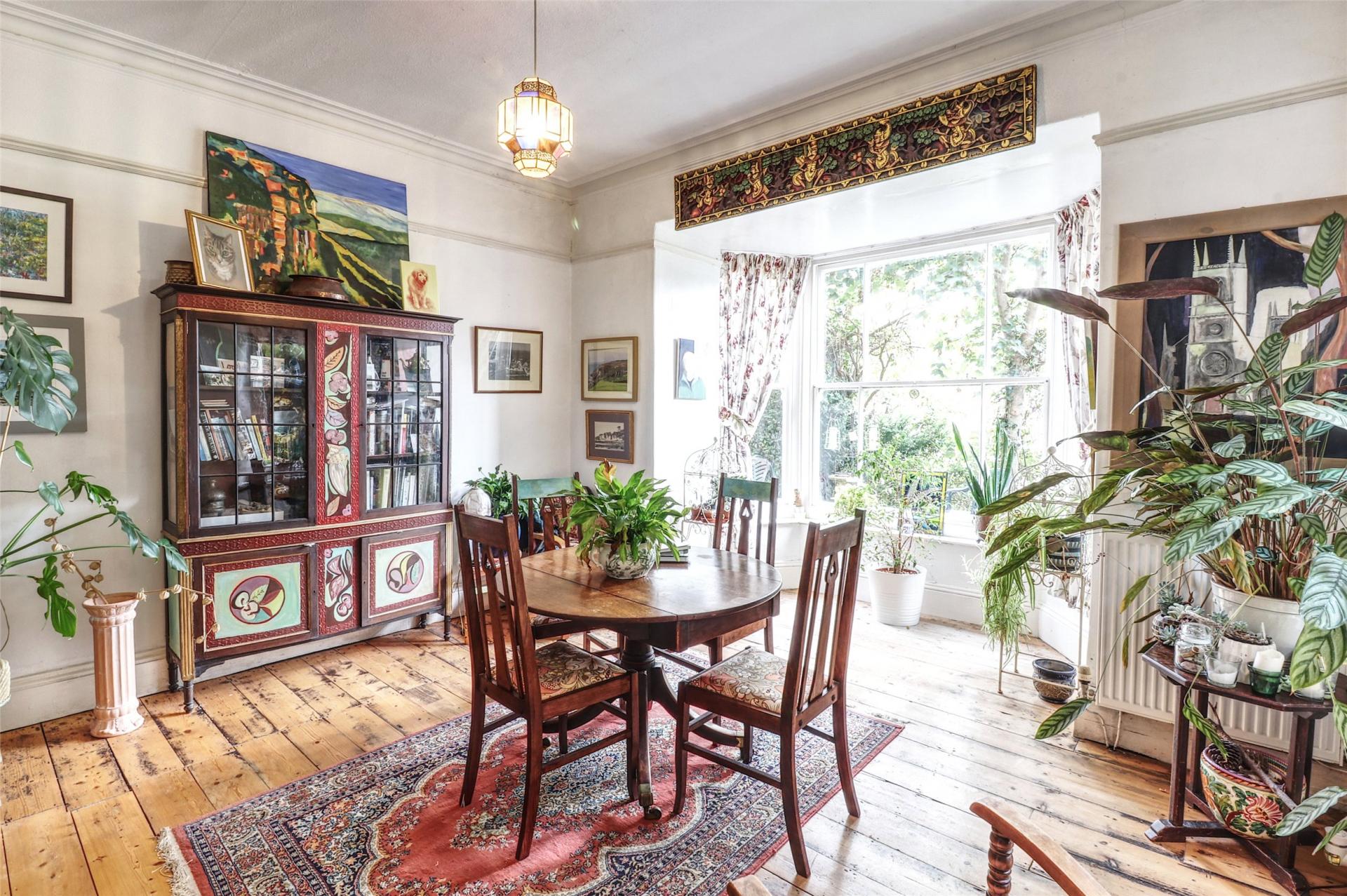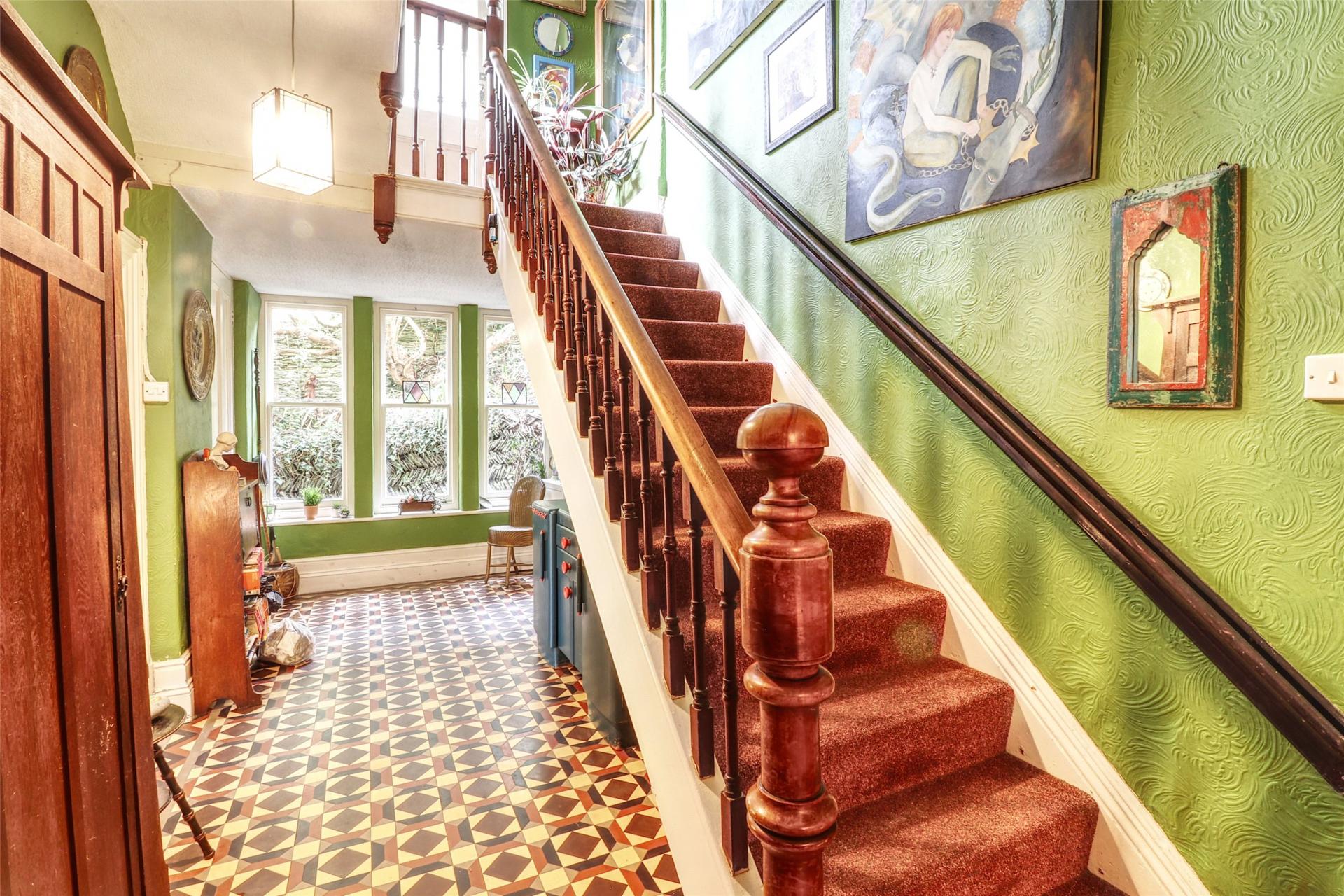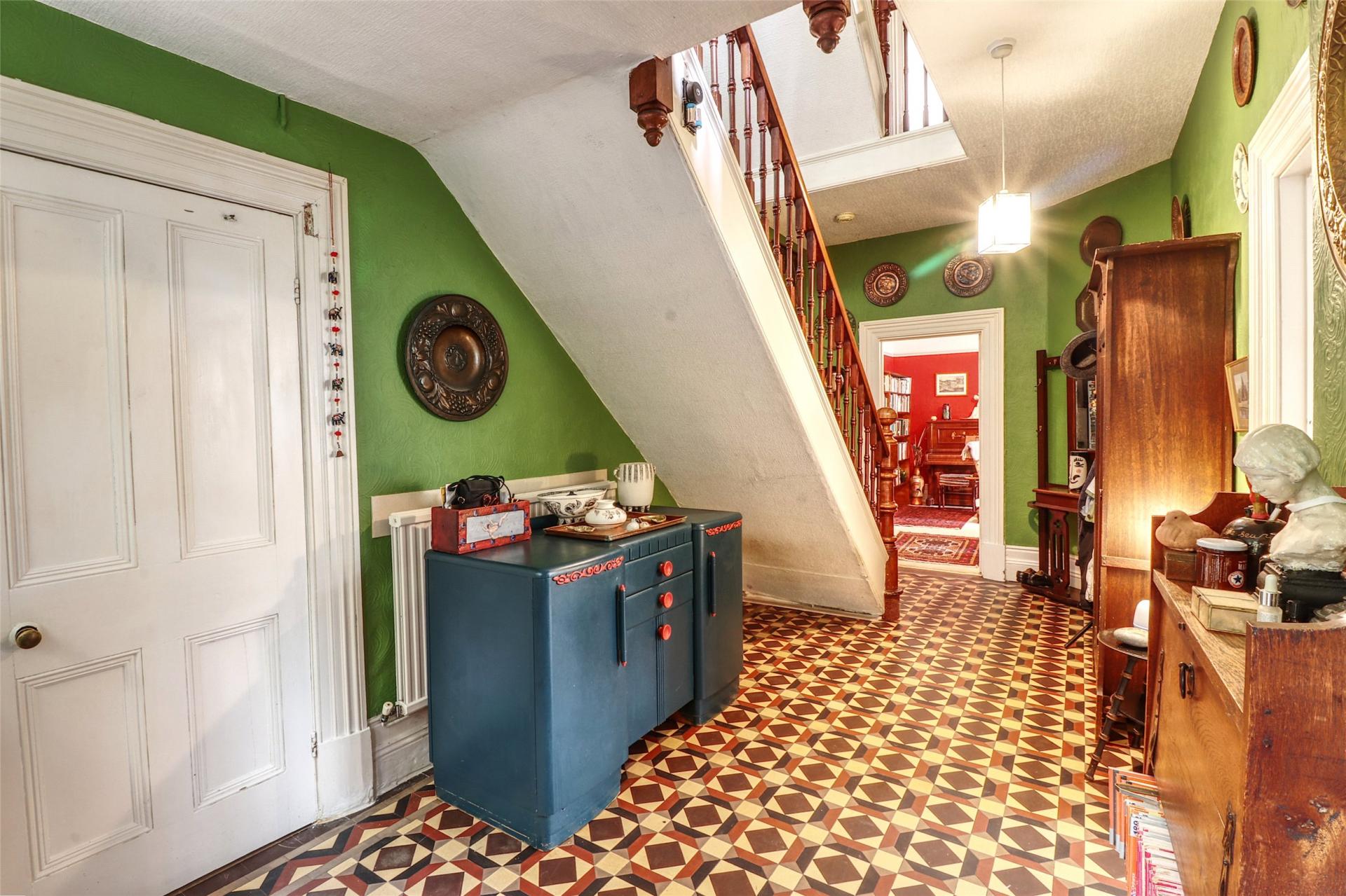 From the moment you enter, the sense of space and character is clear. A tiled entrance porch leads into a welcoming hallway, laid with original minton flooring and featuring a sweeping staircase with turned spindle balustrade. To the front, the main lounge (23' x 15') is a grand and elegant space with tall Gothic arched windows, decorative alcoves, ornate cornicing, and a central fireplace. Adjacent is the formal dining room (17' x 13'), a light-filled room with original stripped wooden floors and a front-facing bay window.