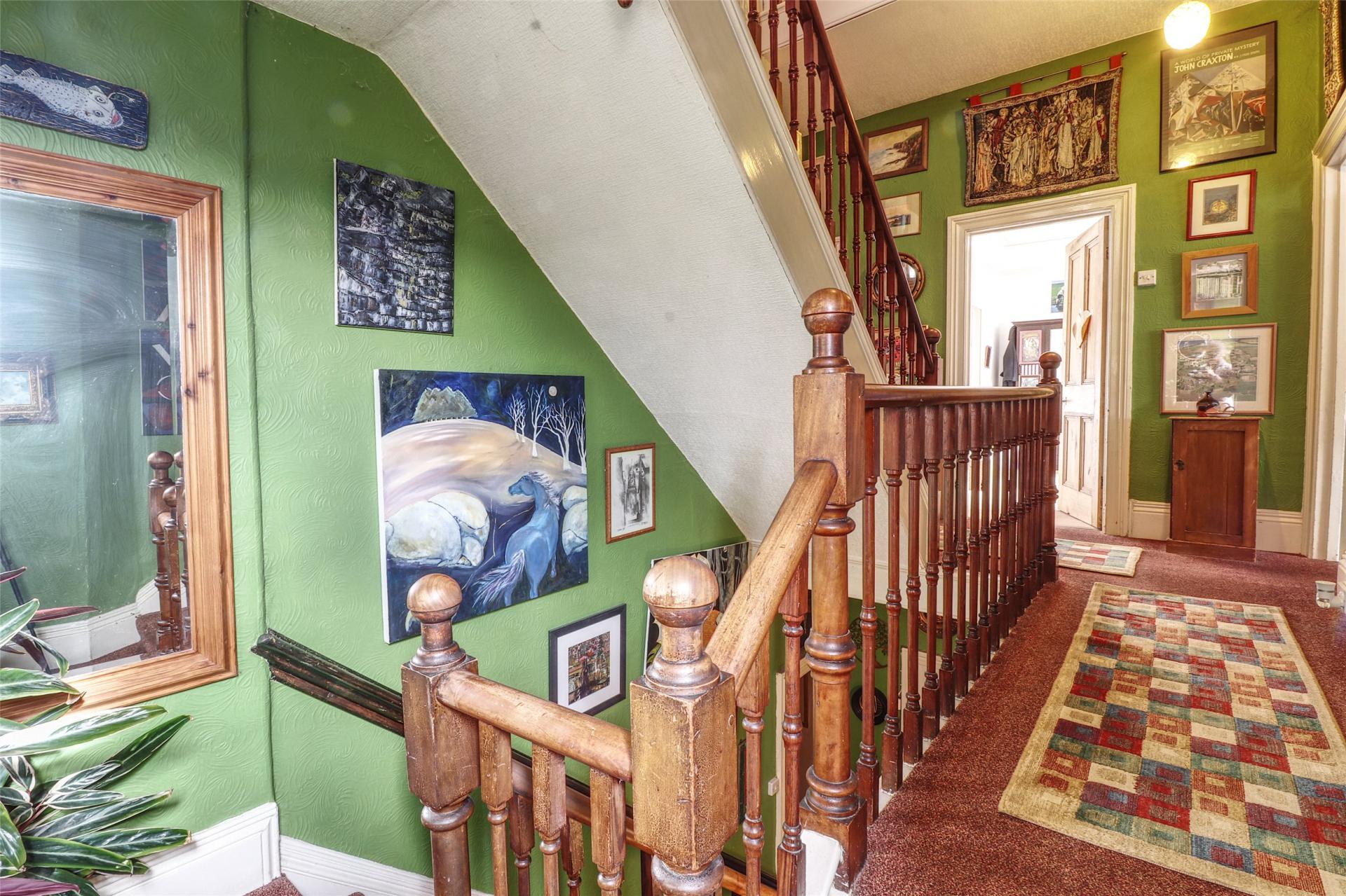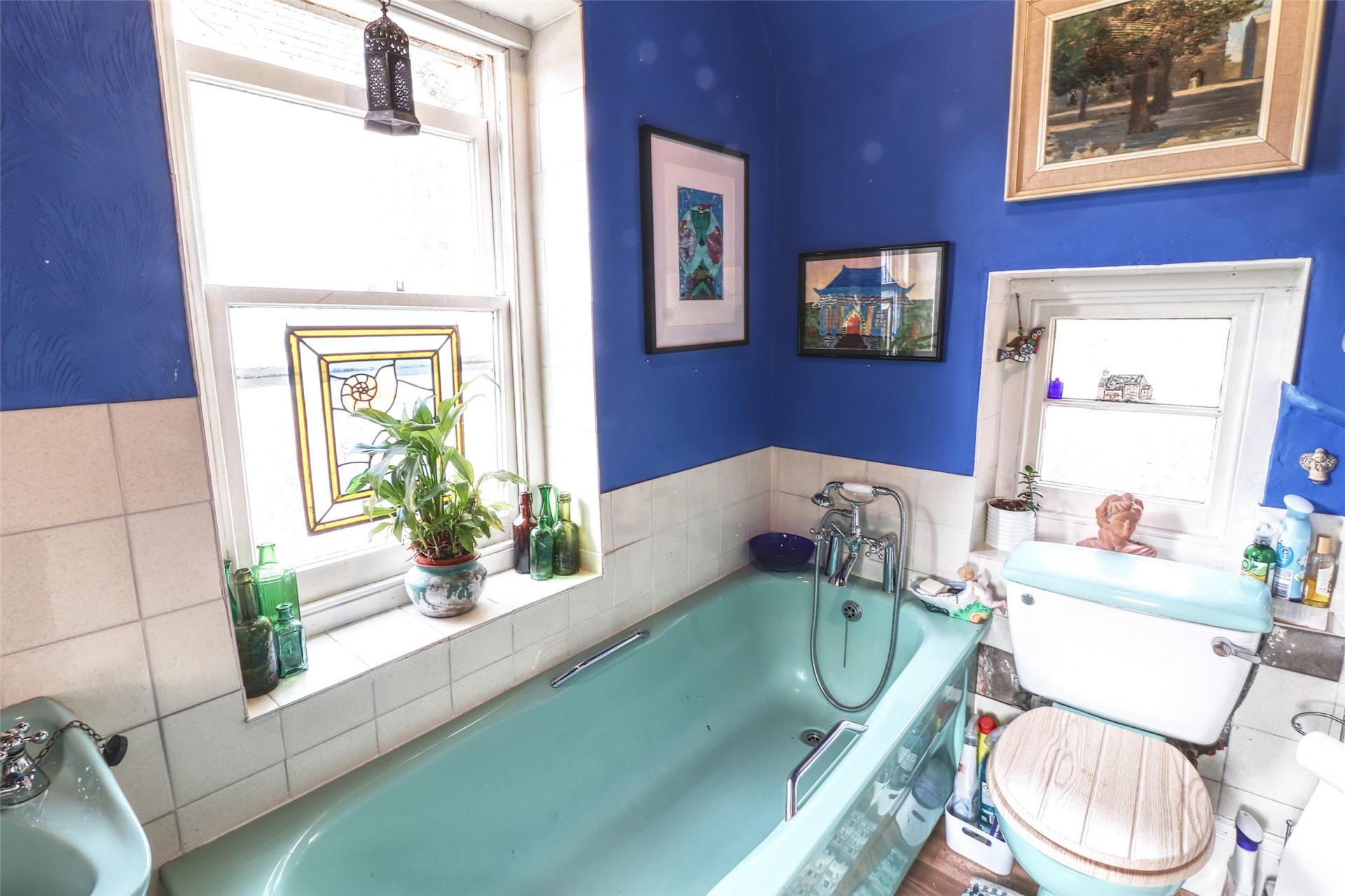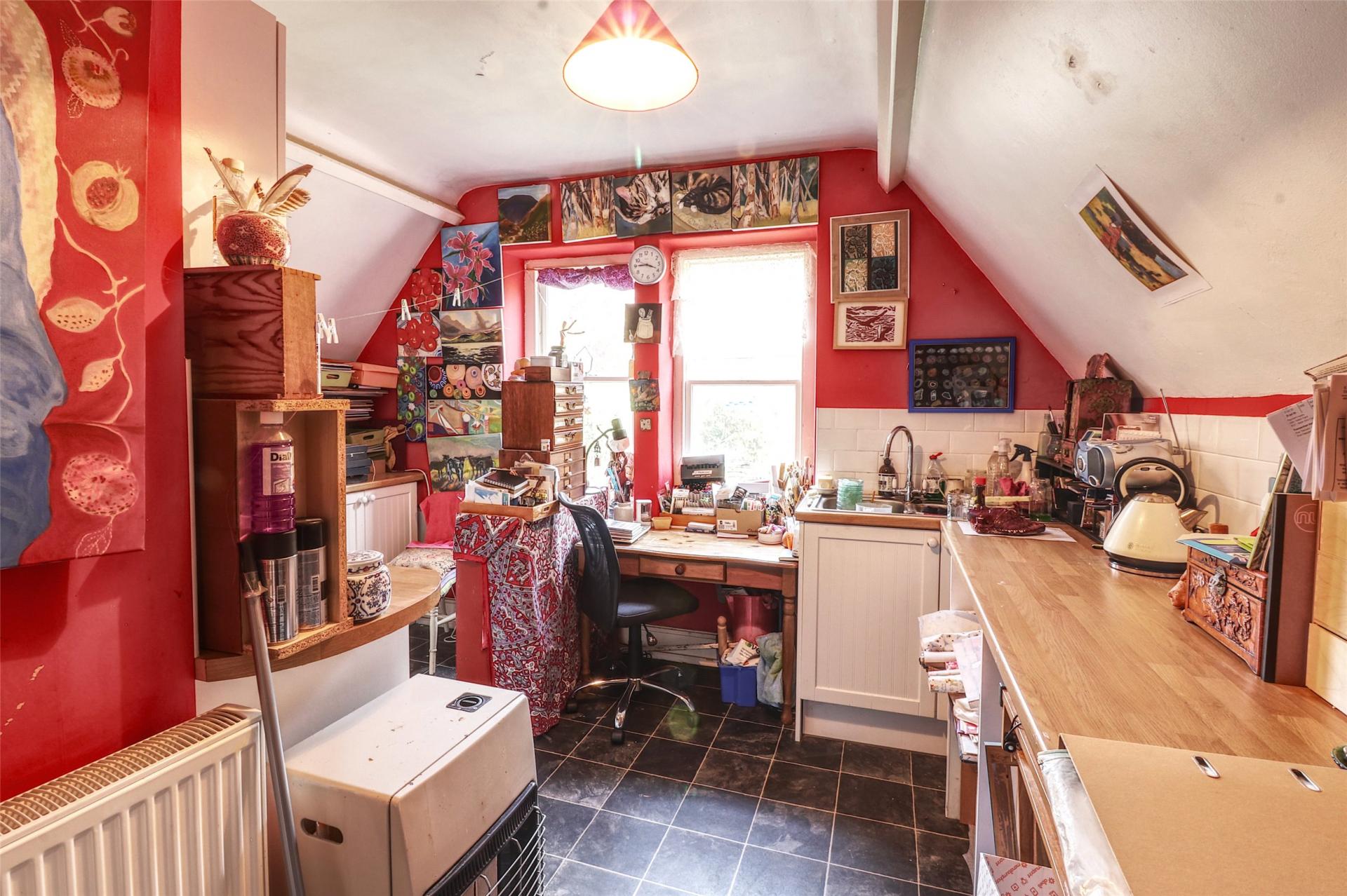 A second staircase rises to the top floor, where you are met on the landing with an original three piece teal bathroom suite. The top floor is no longer utilised as a flat, but offers fantastic potential to be adapted into a self-contained area for guests or a dependent relative, giving them privacy while remaining connected to the main household. This level comprises three spacious double bedrooms, each featuring ornamental cast iron fireplaces. One of the bedrooms also benefits from its own hand basin. Additionally, there is a hobby room (previously used as a kitchen), which retains its layout and fittings, offering scope to be reinstated as a functional kitchen if required (subject to consents).