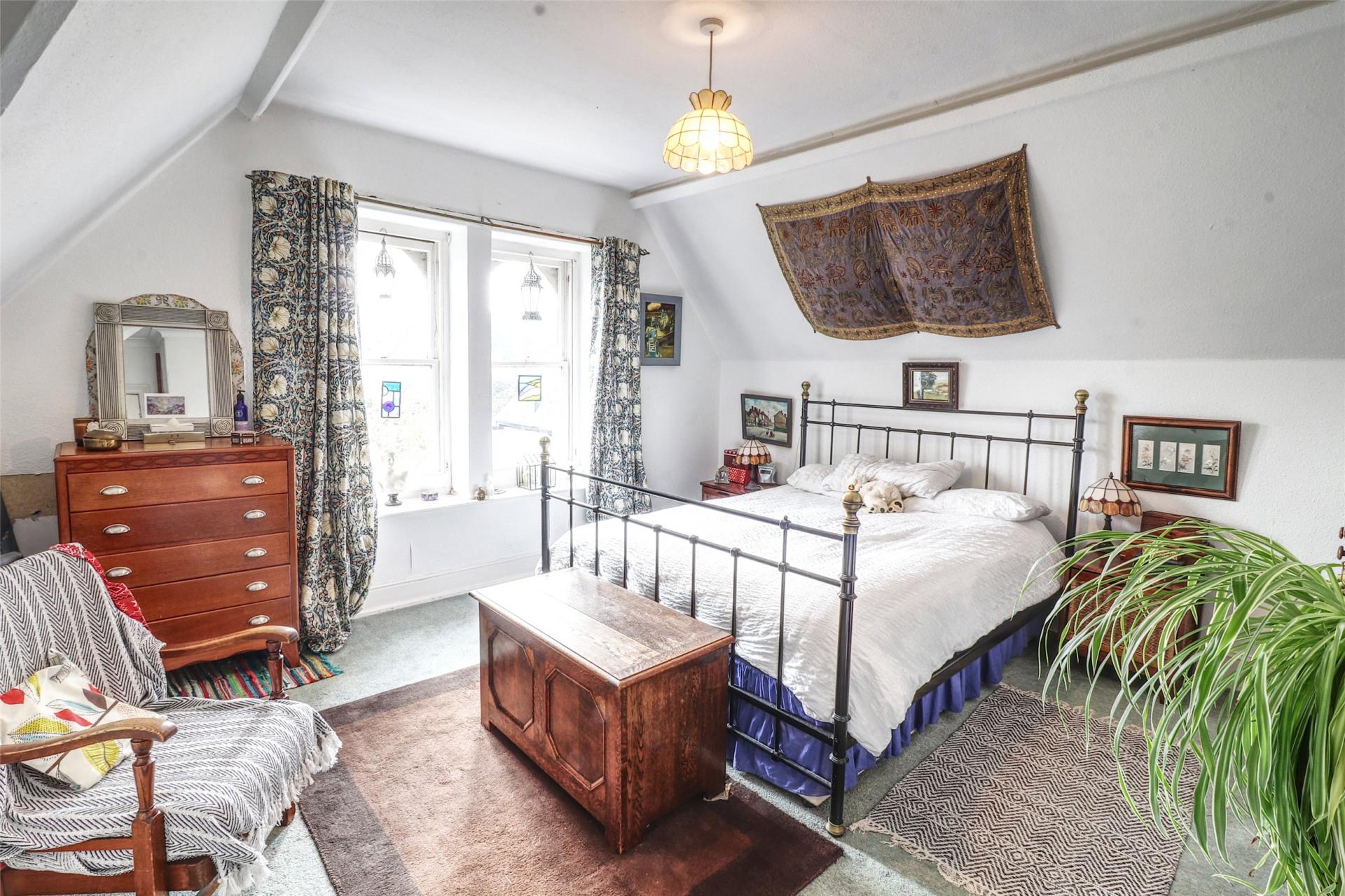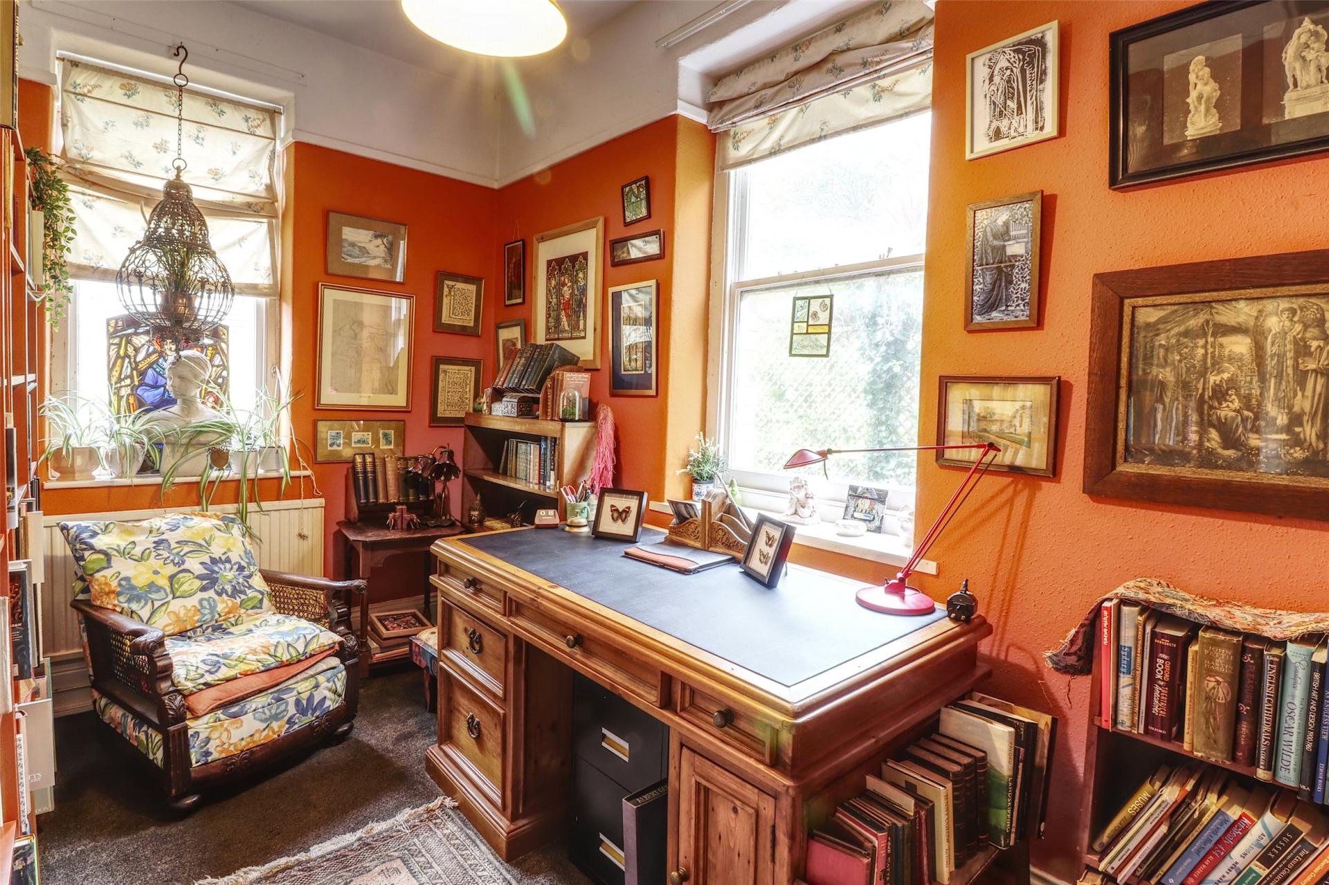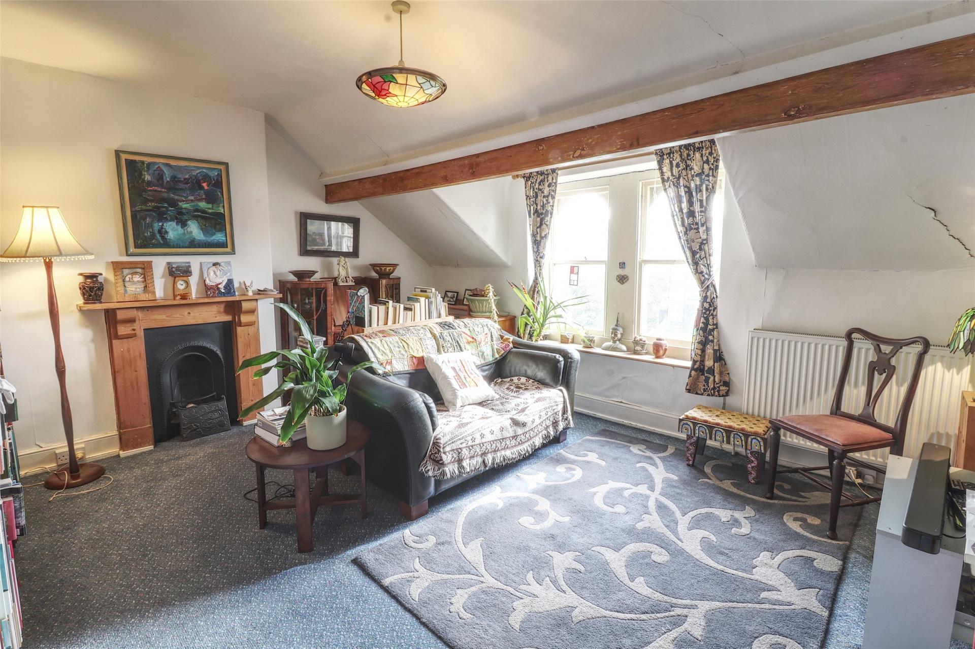 A second staircase rises to the top floor, where you are met on the landing with an original three piece teal bathroom suite. The top floor is no longer utilised as a flat, but offers fantastic potential to be adapted into a self-contained area for guests or a dependent relative, giving them privacy while remaining connected to the main household. This level comprises three spacious double bedrooms, each featuring ornamental cast iron fireplaces. One of the bedrooms also benefits from its own hand basin. Additionally, there is a hobby room (previously used as a kitchen), which retains its layout and fittings, offering scope to be reinstated as a functional kitchen if required (subject to consents).