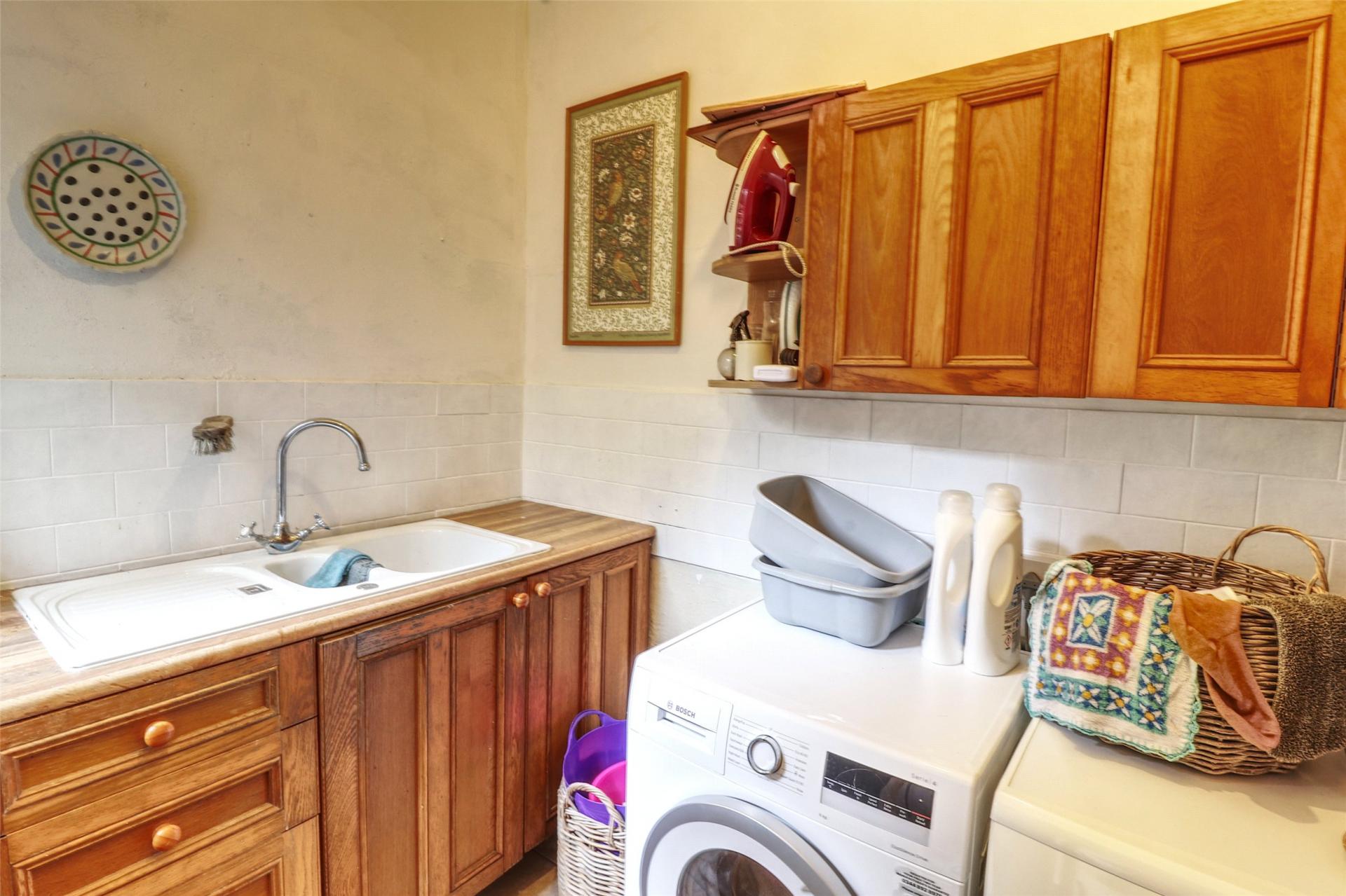 At the rear of the property, the kitchen/breakfast room (18' x 15') forms the heart of the home with the added benefit of a newly slated roof. It is fitted with a stylish range of modern cabinetry, granite worktops, and a Corian sink, complemented by two cupboards — one housing the newly fitted gas-fired boiler and a sepperate walk-in larder During the current owners ownership, they have also had a velux window fitted to allow more natural light into the kitchen. Beyond the kitchen, a large utility/service area leads out to the rear garden and includes space for laundry appliances. This space offers excellent scope for conversion into further accommodation if desired (subject to necessary permissions). A ground floor WC is also accessed from the main hallway.