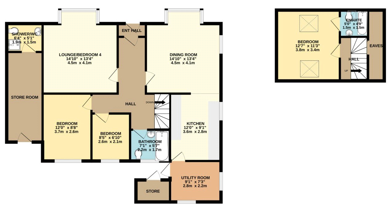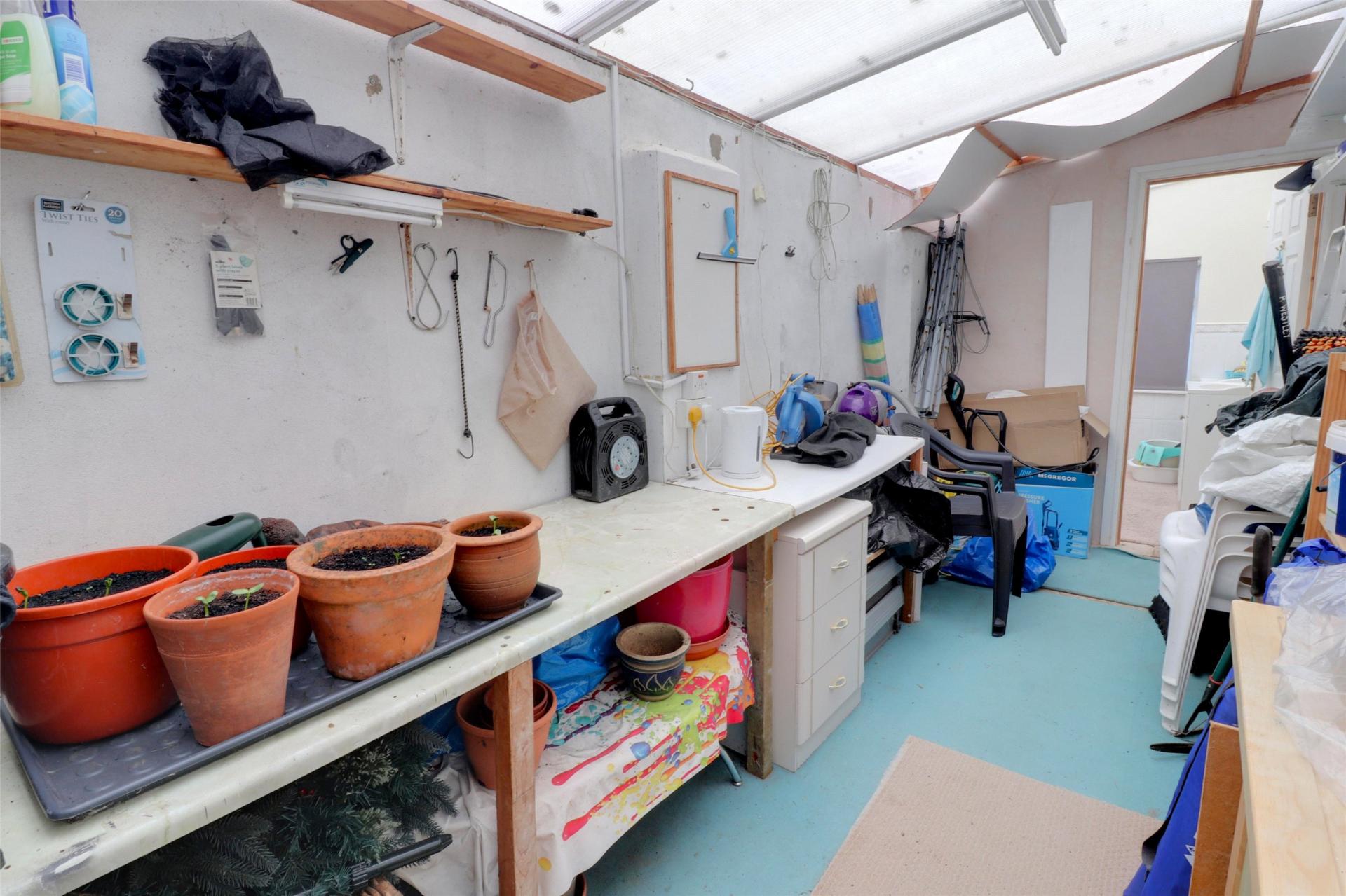 Adjoining the rear of the bungalow is a versatile garden room/workshop, which is complete with a shower, wash basin, and W.C. In the past, this area has been integrated into the main living accommodation and could easily be repurposed again—perhaps as a home office, guest suite, or hobby room.