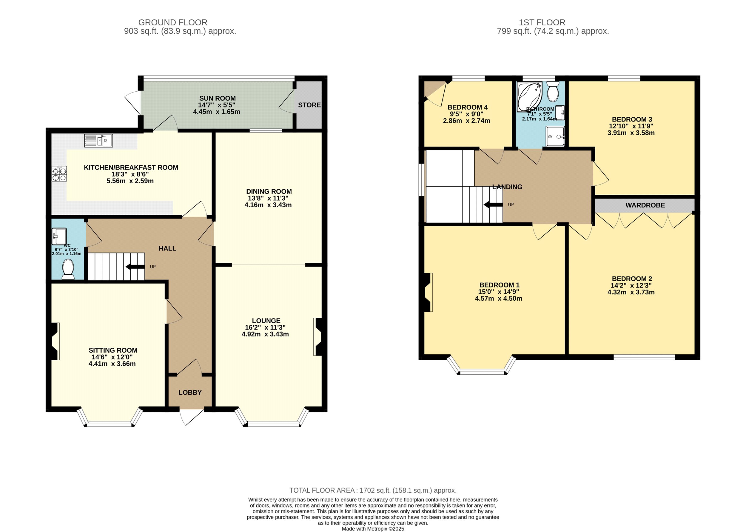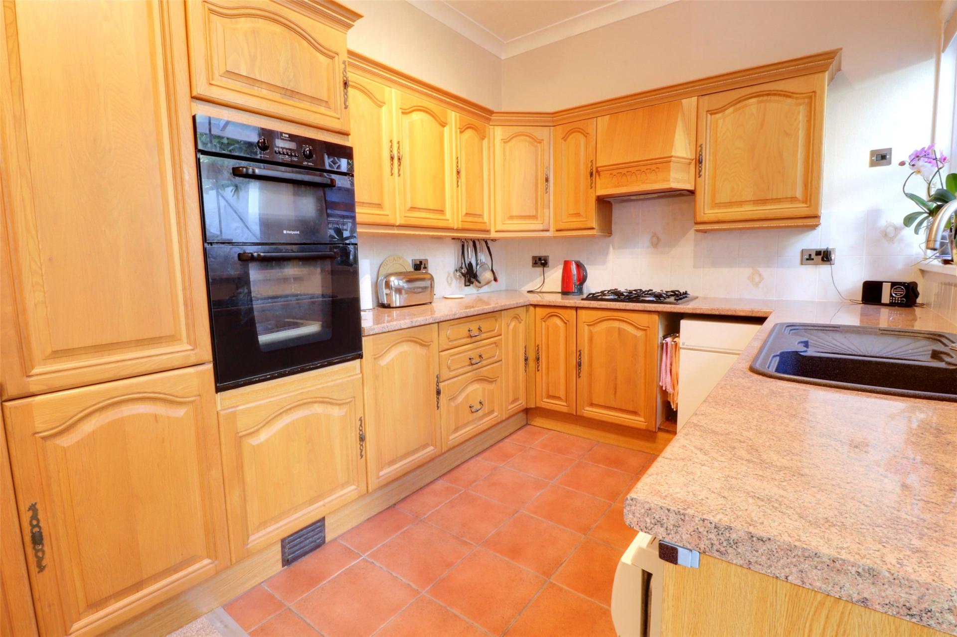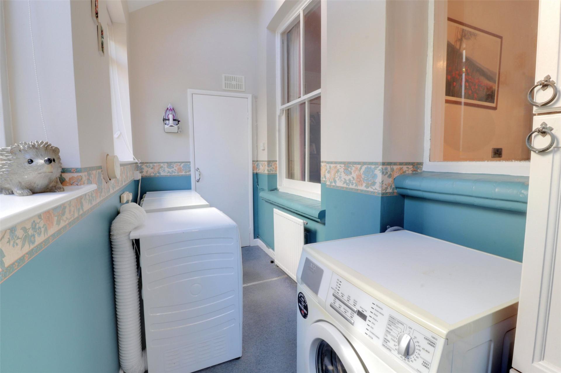 At the rear of the property, the kitchen is fitted with a wide range of cupboards and provides plenty of storage. A breakfast table sits comfortably within the space, making it ideal for informal meals. Practical features include two sinks with drainer, a four-ring gas hob, and a gas boiler. From here, there is easy access out to the rear garden via a solid roof conservatory serving as a spacious utility room with a large floor-to-ceiling storage cupboard. A convenient under-stair WC with cupboard storage completes the ground floor. The staircase leads to a generous first-floor landing, from which all bedrooms and the family bathroom are accessed. There is also access via a fixed, pull-out ladder to a full-height, fully-boarded loft.