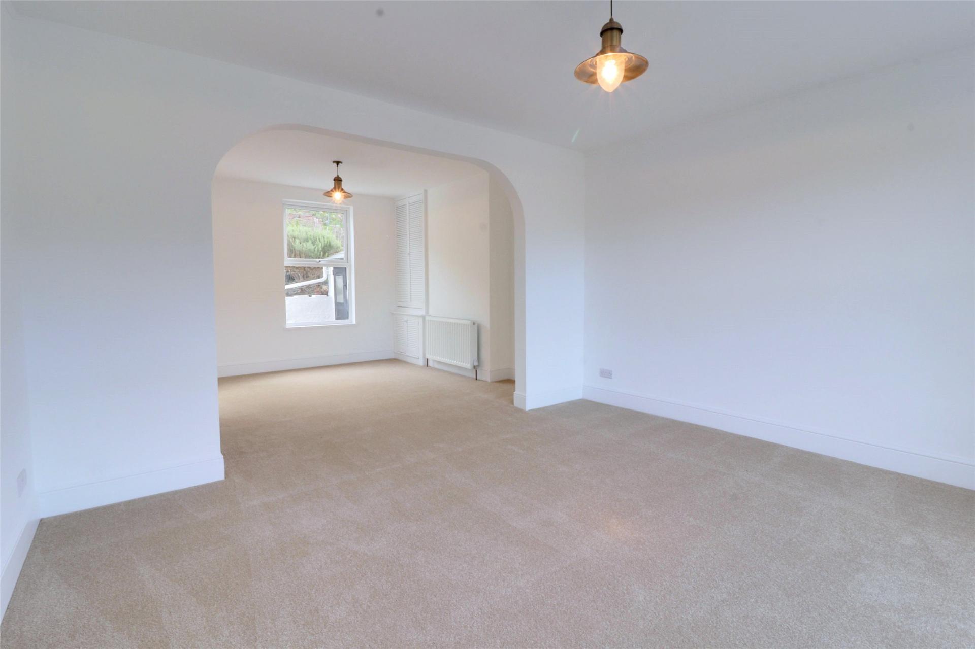 The open-plan dining and lounge area offers a bright and inviting space, enhanced by a large bay window with views over The Torrs. A discreet cupboard houses the gas combi boiler, maintaining a clean and uncluttered aesthetic. This generous living area provides plenty of space for both relaxation and dining, creating a central hub for the home.
