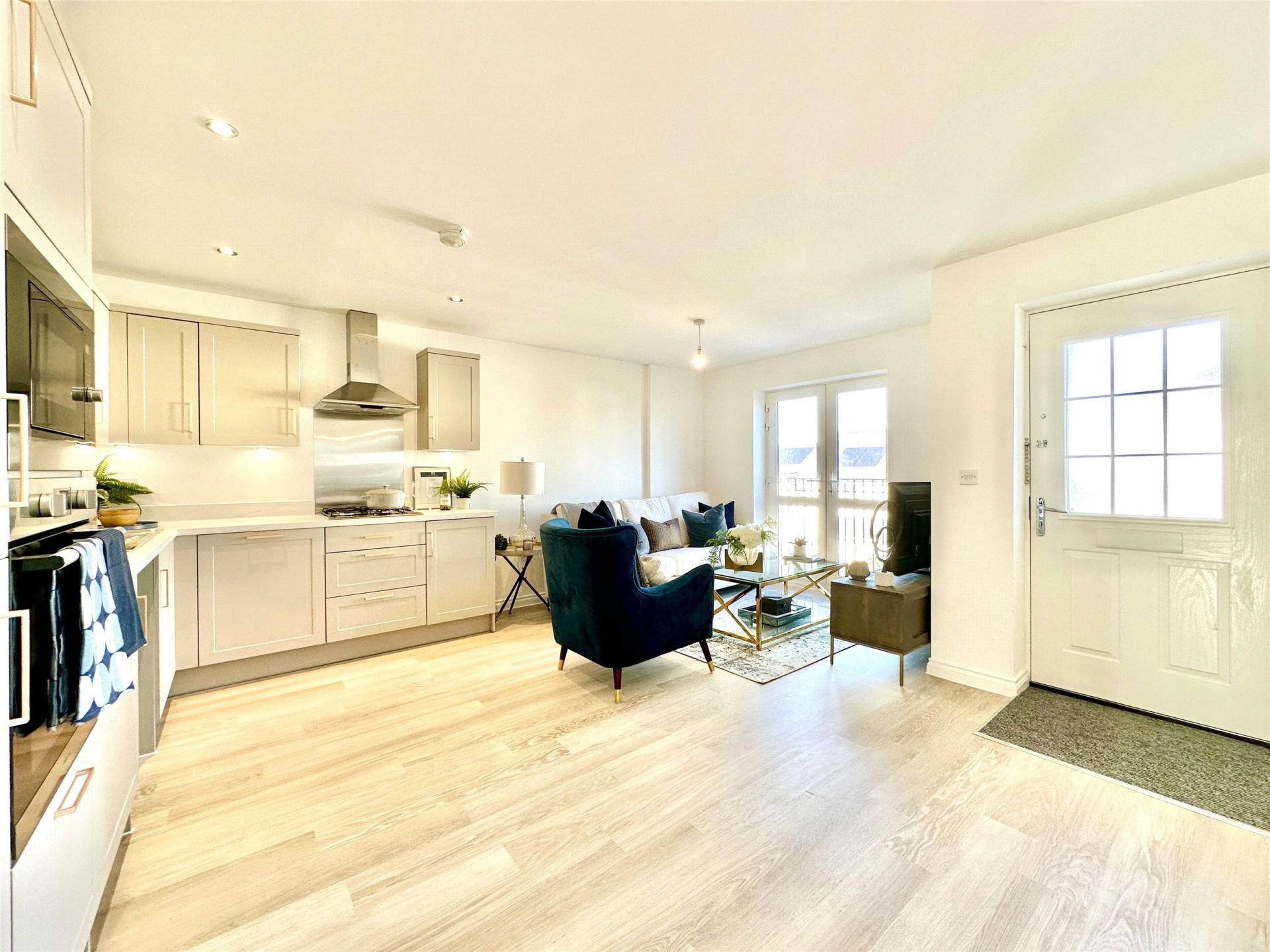 The accommodation is stylish, spacious and bright and airy with the heart of the home being the impressive 22ft long open plan kitchen, lounge and dining area. Within the room there are feature French doors that perfectly frame the delightful and far reaching sea and coastal views, and open onto a Juliet balcony. The kitchen has sleek modern units complimented by integrated appliances which include a gas hob with an extractor canopy over, an electric oven and microwave and a 50/50 fridge/freezer. There is also plumbing for a washing machine.