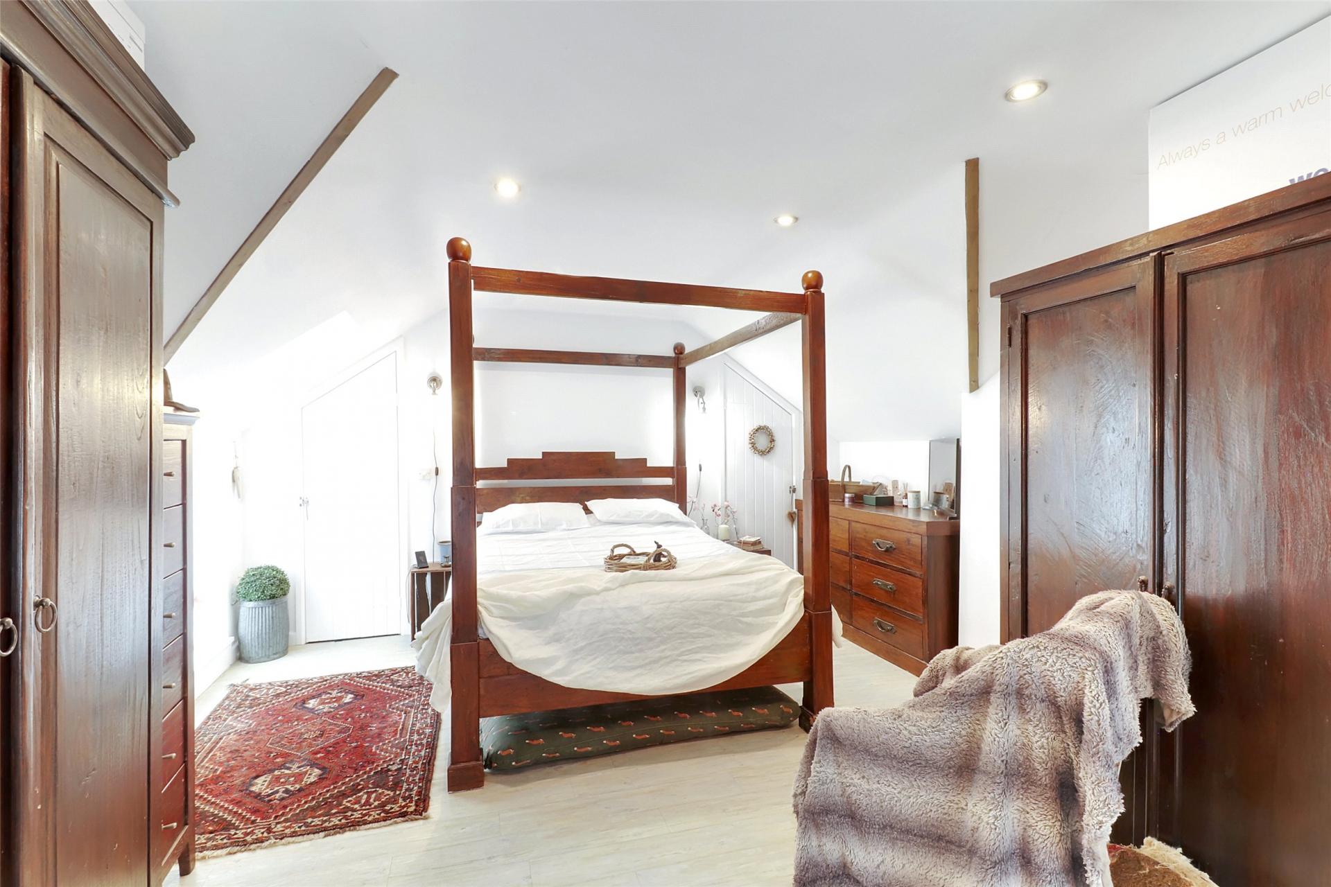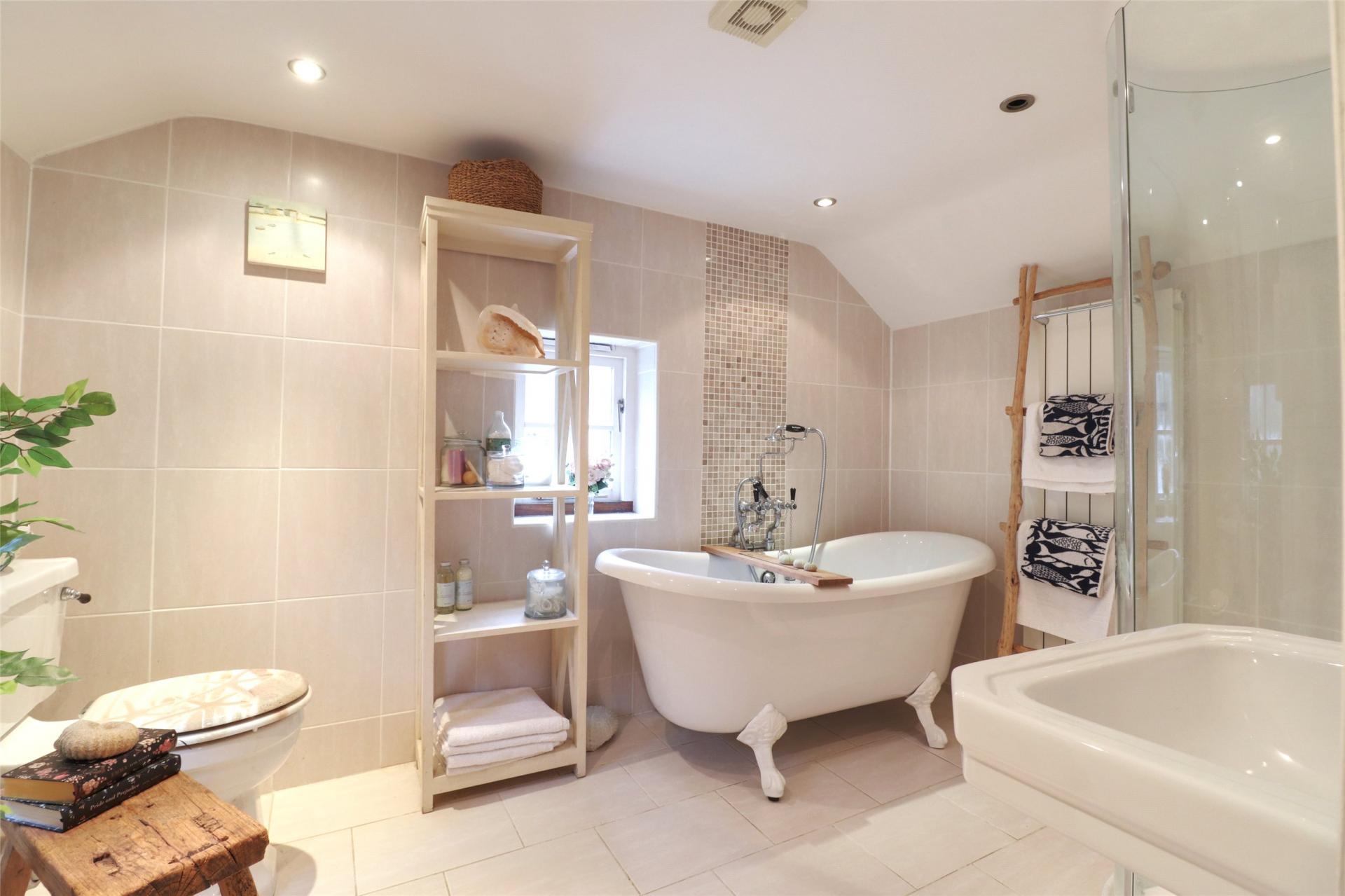 On the first floor, the accommodation comprises three bedrooms, including a spacious principal suite with a dressing area and a luxurious en-suite bathroom. This impressive space features a Burlington claw-foot, double-ended Bateau bath, along with a Kensington basin and taps. A well-fitted shower room serves the remaining first-floor bedrooms.