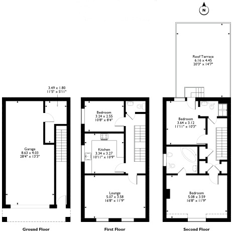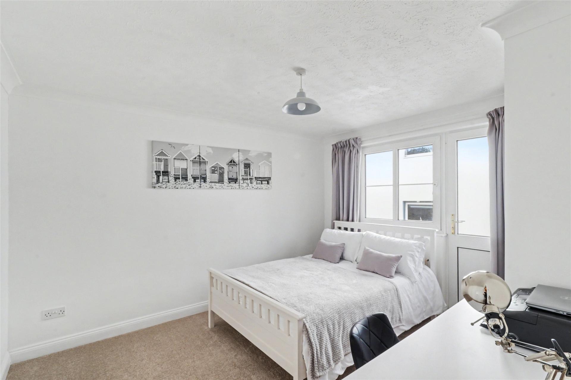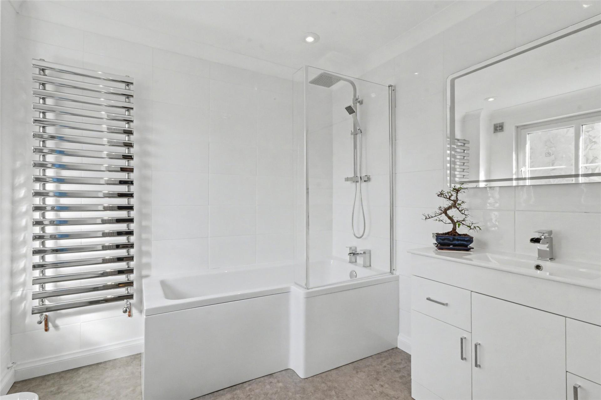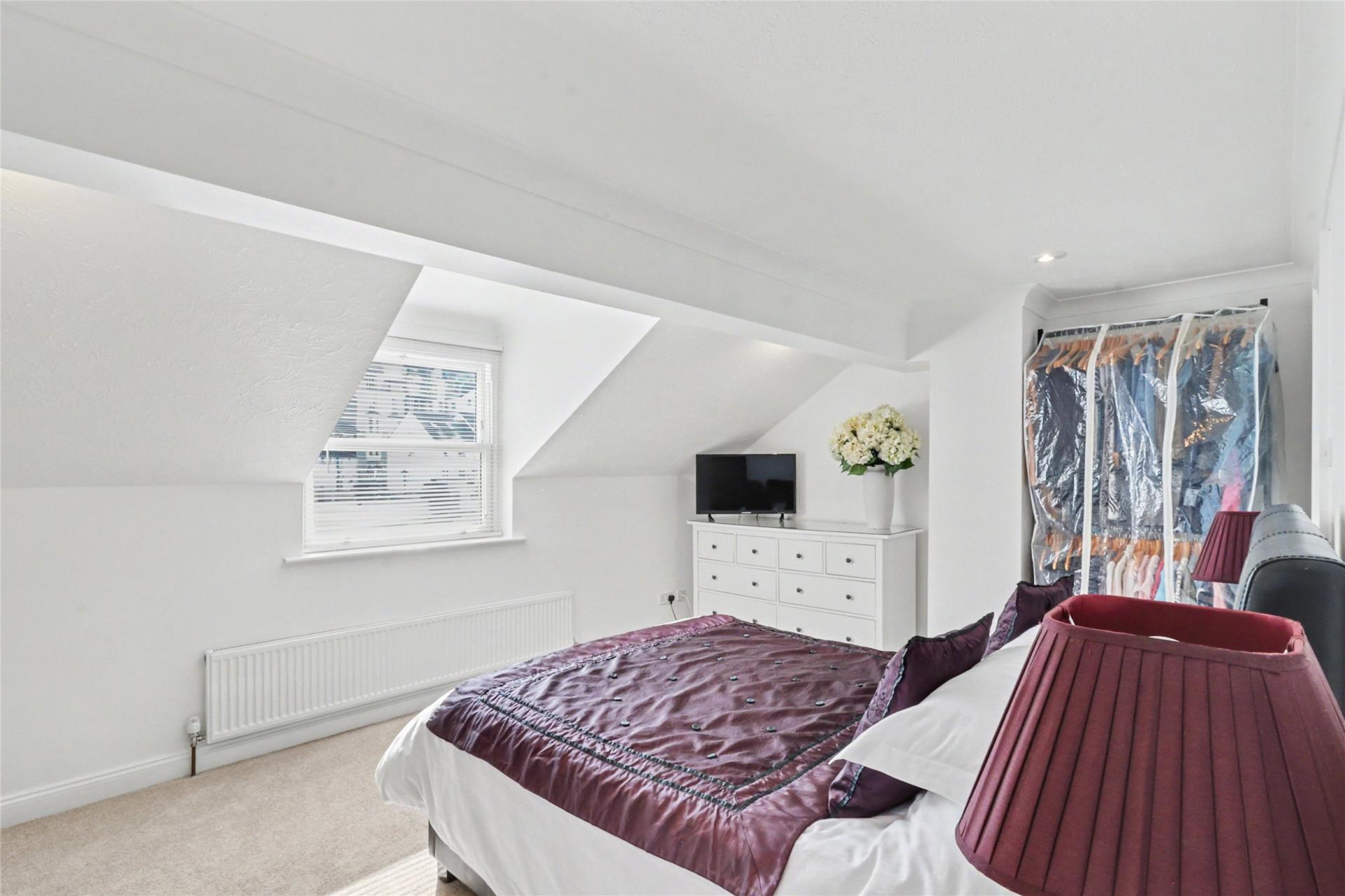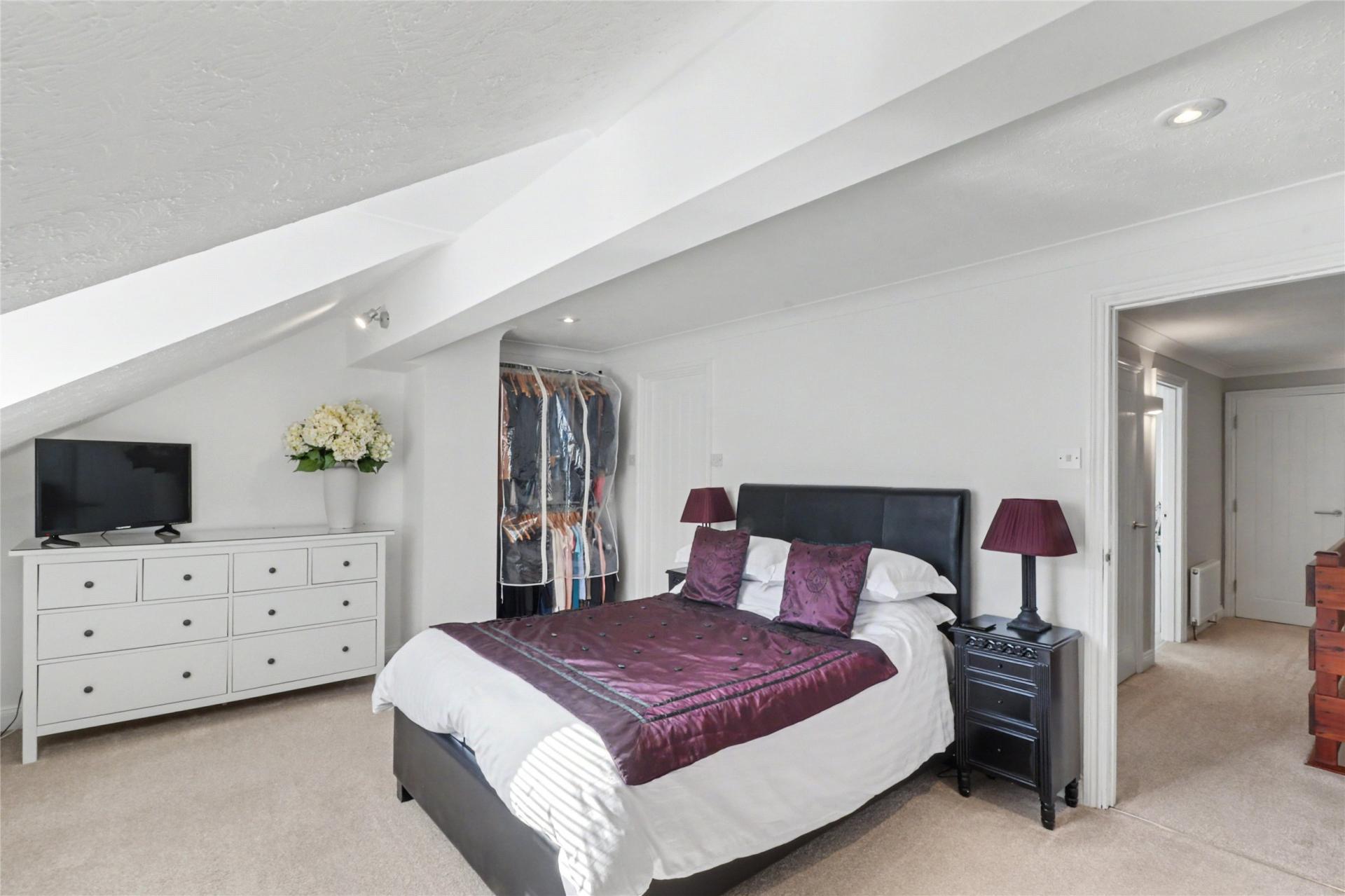 On the second floor, the landing provides access to a large airing cupboard with radiator, along with two additional built-in storage cupboards, one of which includes access to the loft. The impressive 16' x 11' principal bedroom benefits from a generous and modern en-suite bathroom. The second bedroom is another good-sized double and includes a Jack and Jill en-suite shower room, accessible from both the bedroom and the landing, fitted with a shower cubicle, Mira electric shower, WC, and washbasin. This bedroom also provides direct access to the roof terrace.