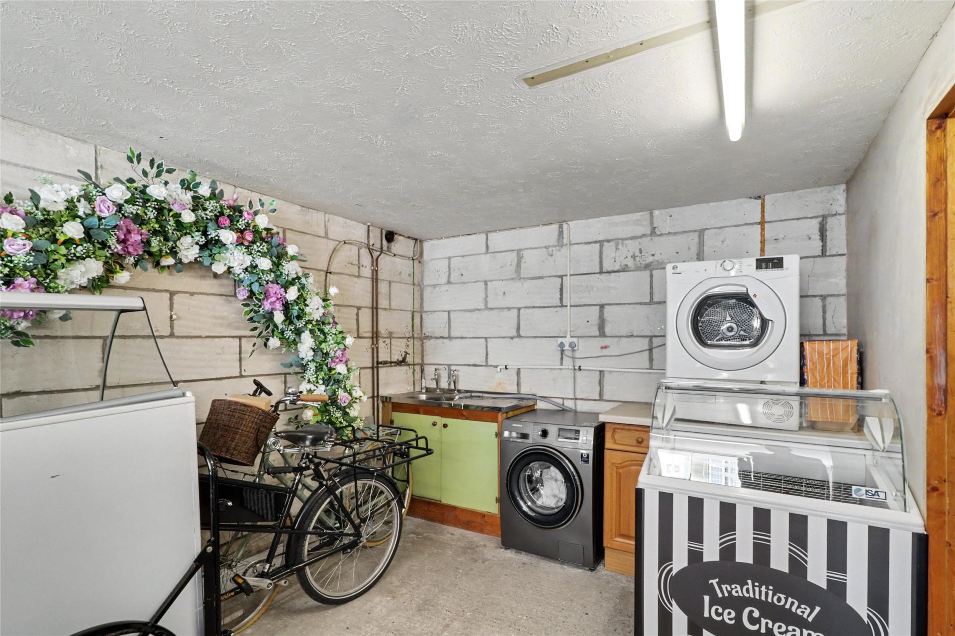 Arranged across three levels, the ground floor features an impressive double-length garage measuring approximately 27' x 12', complete with an electric roller door, lighting, and power supply. It also includes a sink with hot and cold water, plumbing for a washing machine, and space for a tumble dryer. To the rear of the garage is a generously sized study or home office, also equipped with power and lighting.