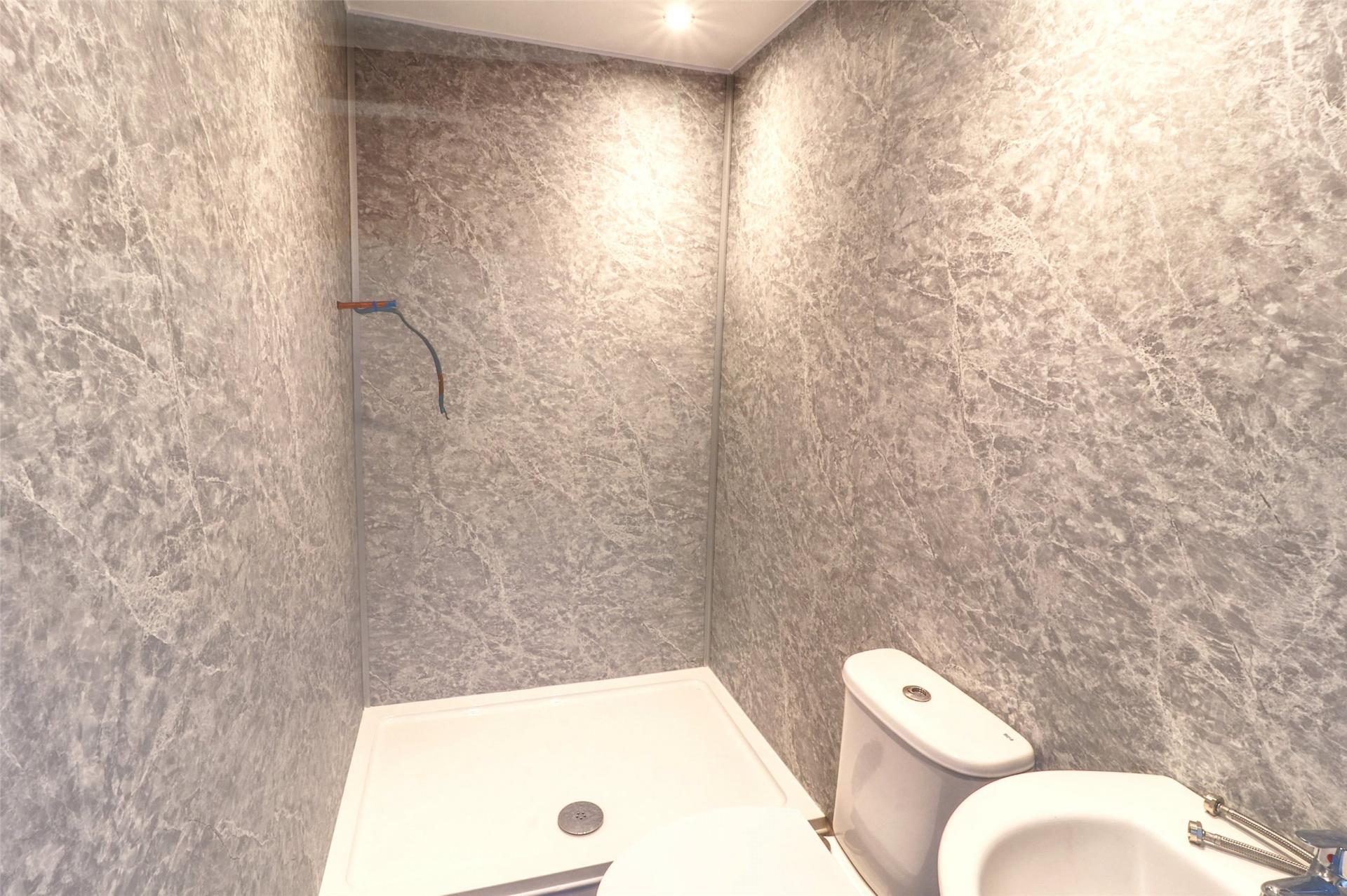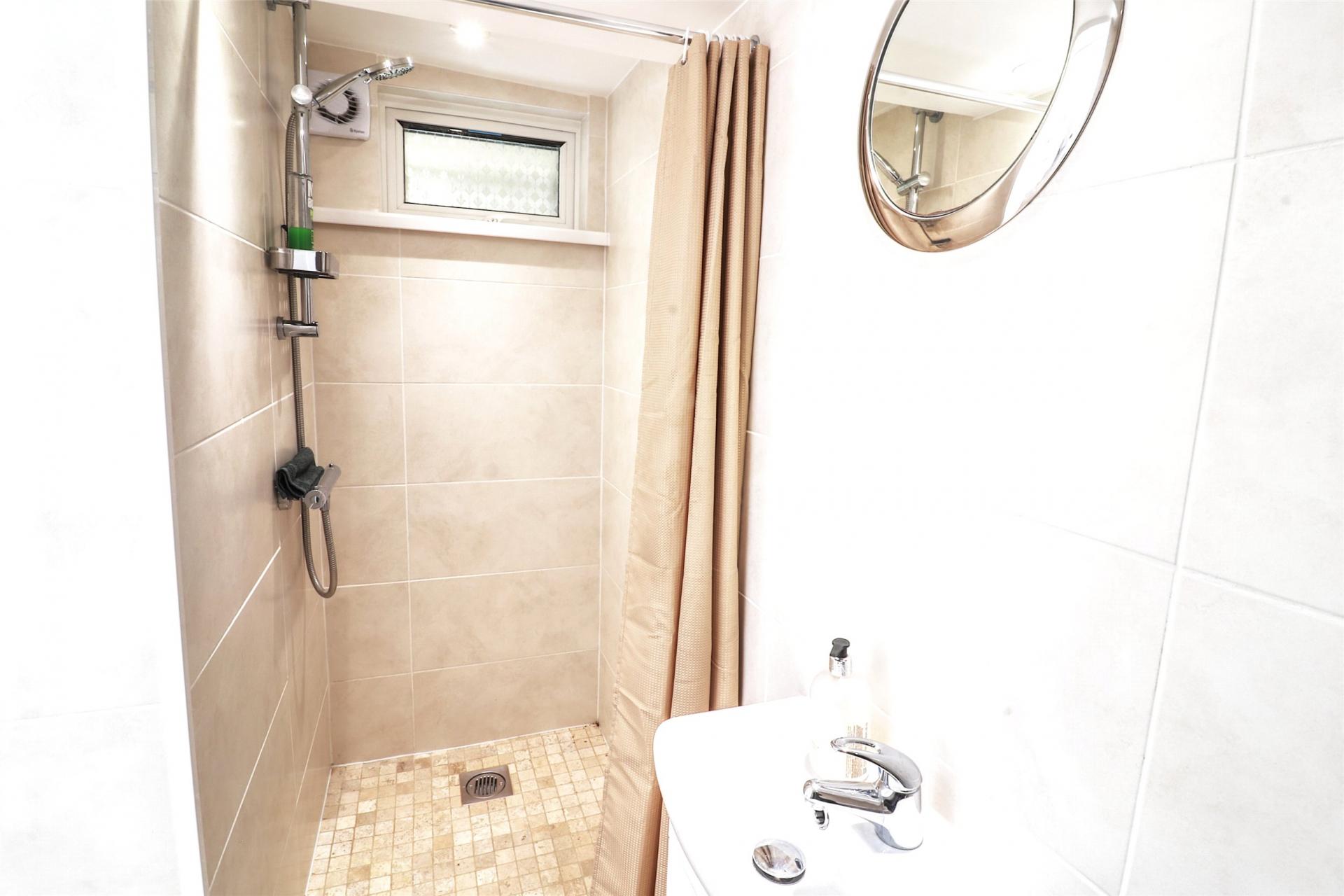 To the rear of the property is a newly fitted, modern white kitchen with dark laminate work surface. The kitchen features ample storage, a built-in oven, integrated four-ring electric hob with extractor over, a fitted dishwasher, and space and plumbing for a washing machine. There is also space for an up-and-over fridge-freezer or scope to have this built into the kitchen. From here, there is direct access to the rear garden, as well as to a convenient wet room—comprising a shower, WC, and wash basin—ideal for use after days at the beach or as a secondary bathroom for guests or ground-floor living.