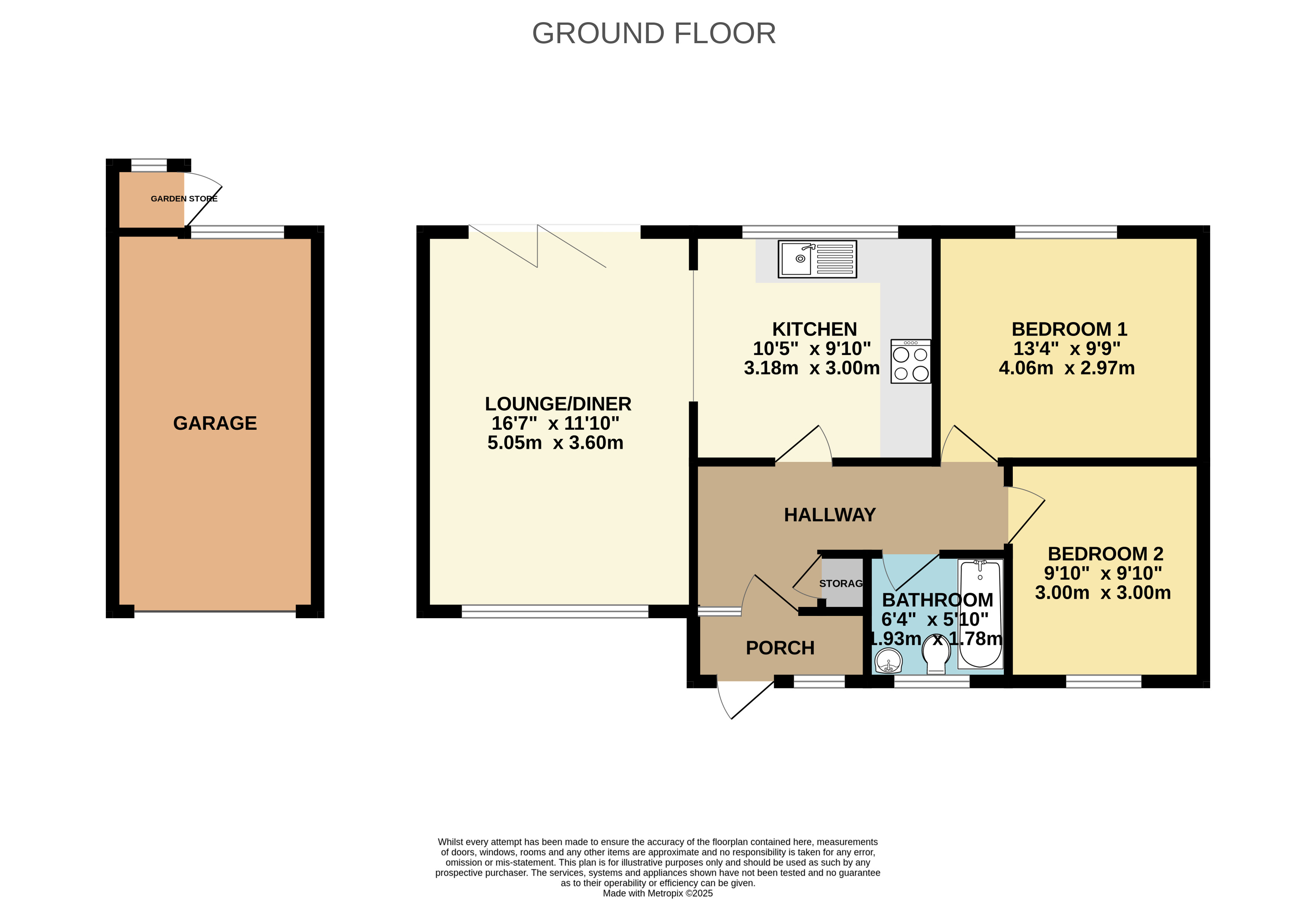 Outside, at the front of the bungalow, a tarmacked hand standing provides off-road parking for one vehicle and leads to the detached single garage. The front garden is laid primarily to lawn and has flowerbed borders with a palm tree, shrubs and bushes. Access from both sides of the property leads around to the rear. Stretching across the rear of the bungalow is a raised terrace area which can be directly accessed via the lounge and kitchen. The main part of the garden comprises a good sized and enclosed lawned area with well-stocked flowerbeds surrounding. There is a useful brick built store shed and mature hedge and walled boundaries making the property dog and child proof. The gardens enjoy plenty of the day’s sunlight and the excellent far reaching views. There is also a detached single garage, with an up and over door, as well as having power and light connected.