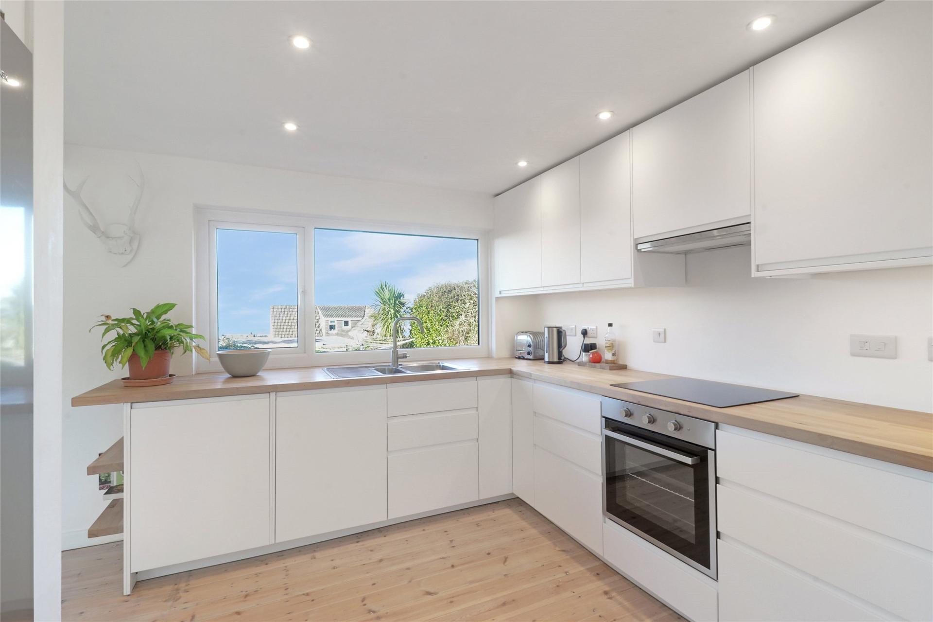 The stylish new kitchen features modern units, generous worktop space, and plumbing for a washing machine, ensuring convenience and practicality. Large windows allow natural light to flood the entire open-plan area, enhancing the sense of space and comfort.