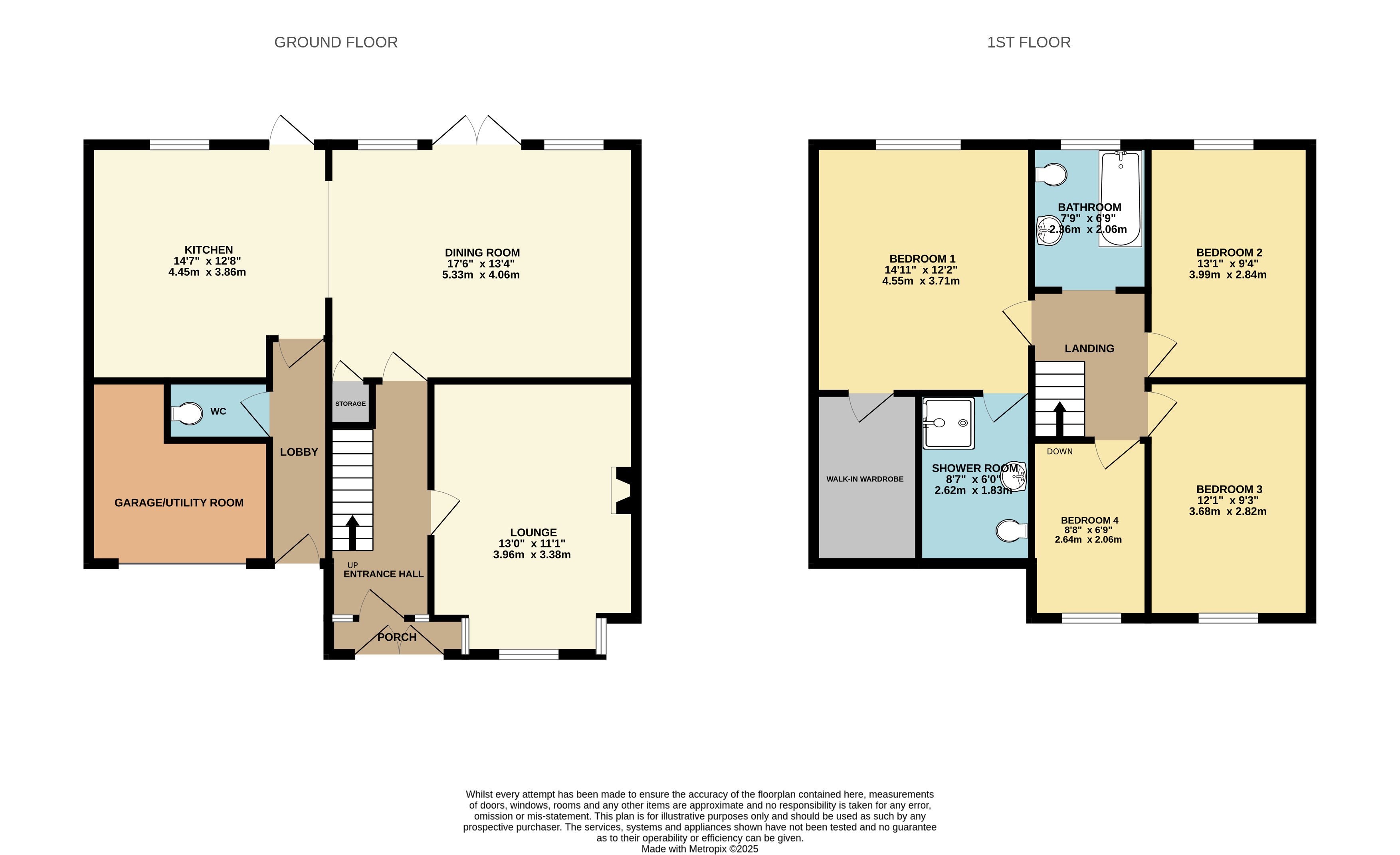 Upstairs, the spacious landing leads to three double bedrooms and one single bedroom. The principal bedroom benefits from a modern en-suite shower room and a walk-in wardrobe. A stylish family bathroom serves the remaining bedrooms. The home is equipped with gas central heating and uPVC double glazing throughout.