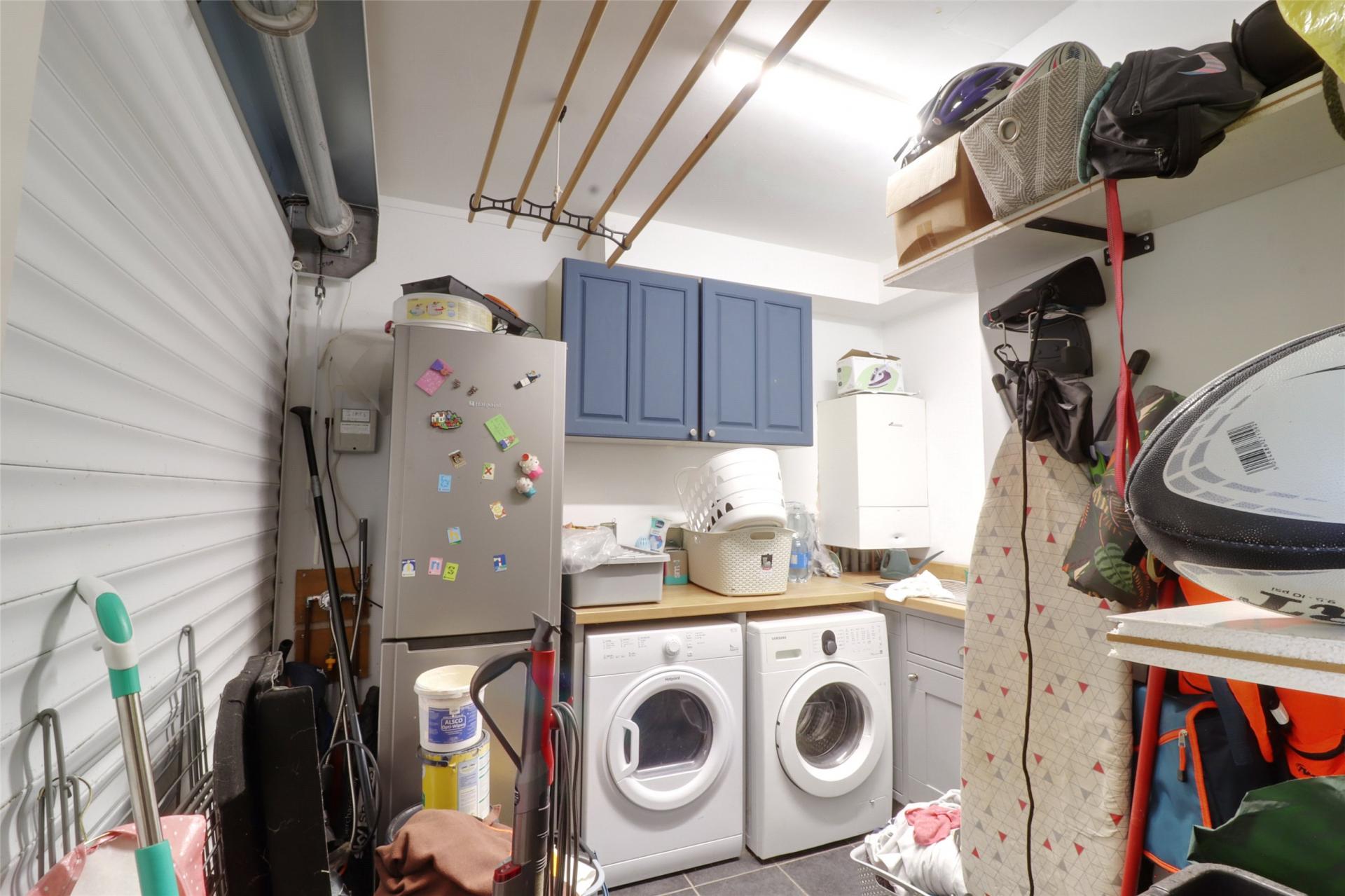 The ground floor features a bright and welcoming tiled entrance hall, a large living room, and a beautifully lit dining room flooded with natural light. The well-appointed kitchen/diner provides access to the rear decked terrace — a perfect spot for outdoor dining. Additional ground floor features include a WC and a versatile garage space currently being used as a utility room.