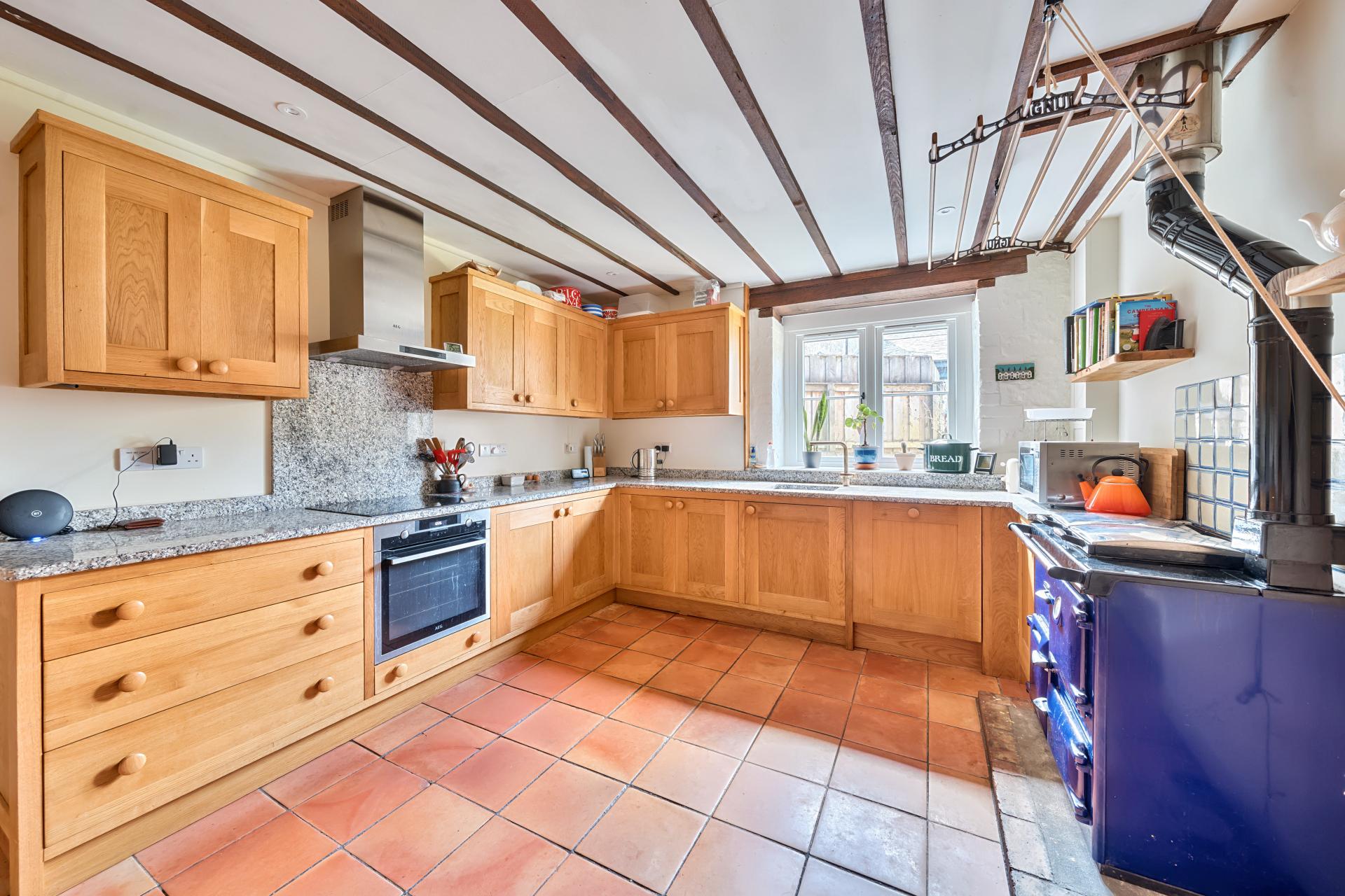 GROUND FLOOR Head in to the house and the ENTRANCE HALL offers a practical space with ceramic tiled flooring and stairs to the first floor. To one side is the SITTING ROOM offering great living space with wood-burning stove nestled in the original stone fireplace, exposed timber beams and large window overlooking the garden to the front. The country-style kitchen sits off the hallway and features solid oak cabinetry and granite worktops for a timeless finish. The exposed ceiling beams add character, complementing the terracotta tiled flooring, which enhances the traditional feel of the space. The kitchen is well-equipped with a built-in oven and hob, alongside a deep blue Rayburn - perfect for those who love to cook and entertain.