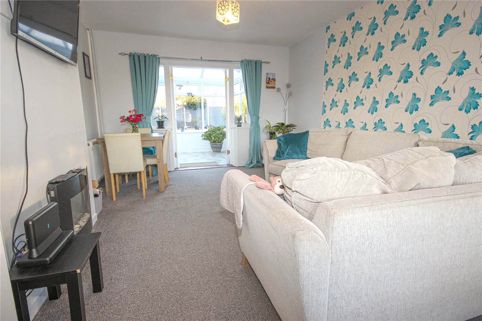 A central ramp with metal handrails from the front garden leads up to the front porch with internal glazed front door into the entrance hallway. To one side is the spacious lounge/diner which has a large picture window facing the front of the property with a central fireplace with modern electric wall mounted fire.