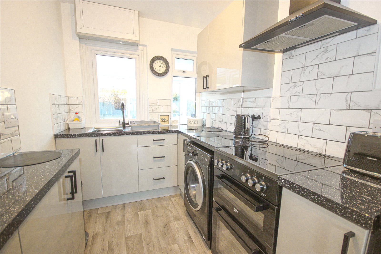 The contemporary galley kitchen benefits from a range of matching grey gloss base and wall units, laminate worktops and flooring, feature marble style subway tiling and integrated extractor. There is space/plumbing for a washing machine, space for a tall fridge freezer and space for a slot in cooker. A cupboard housing the gas central heating combi boiler is situated to one side.