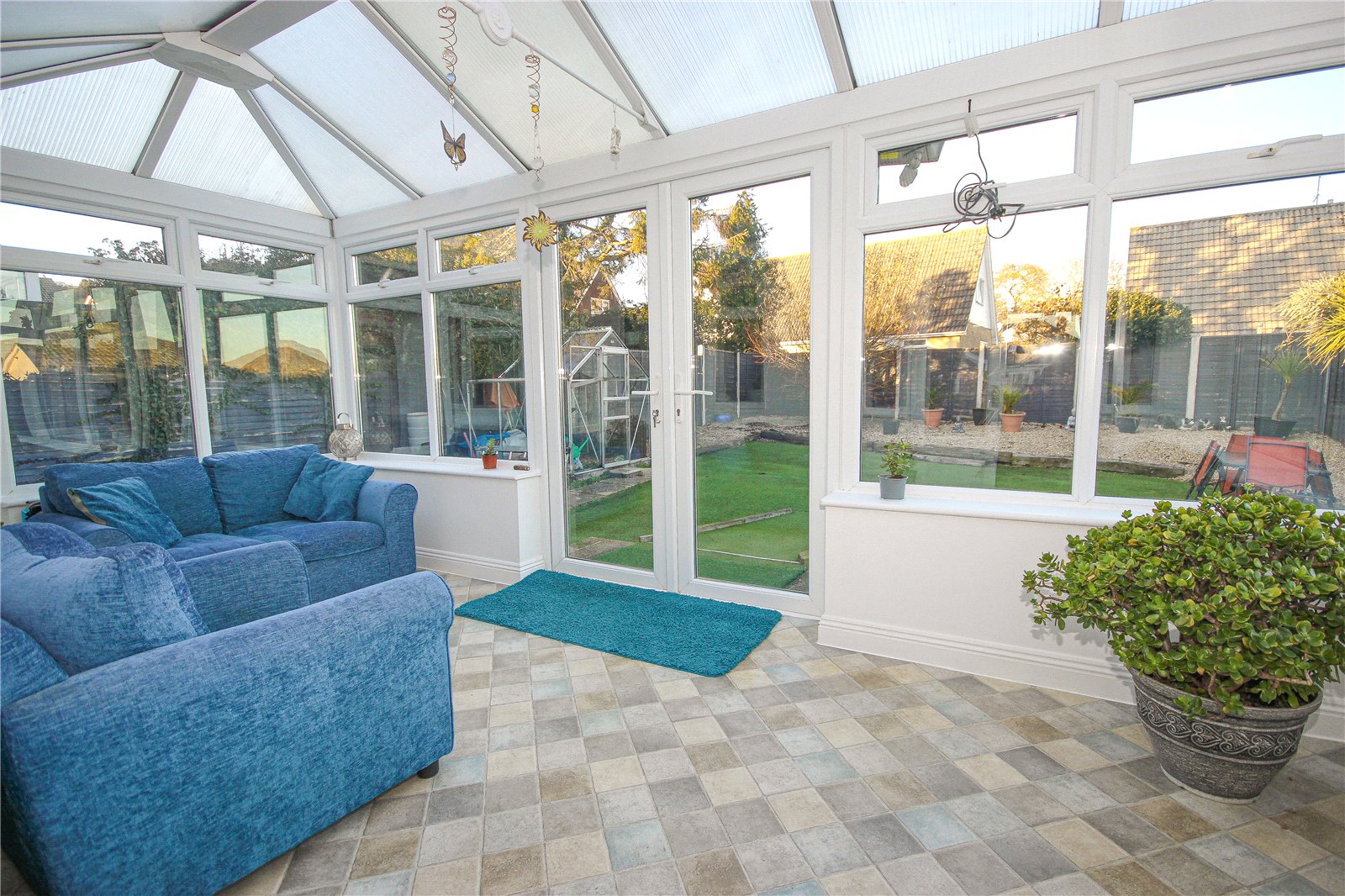 A wooden pedestrian gate to one side with a pathway wraps around to the rear garden which enjoys distant views towards the estuary, wetlands and surrounding countryside. The rear garden is low maintenance and laid mainly to artificial turf with gravel planted perimeters and wooden fence borders to all sides. A patio area is situated immediately adjacent to the conservatory with a central ramp for access leading into the rear garden. There is also an outside tap and greenhouse.