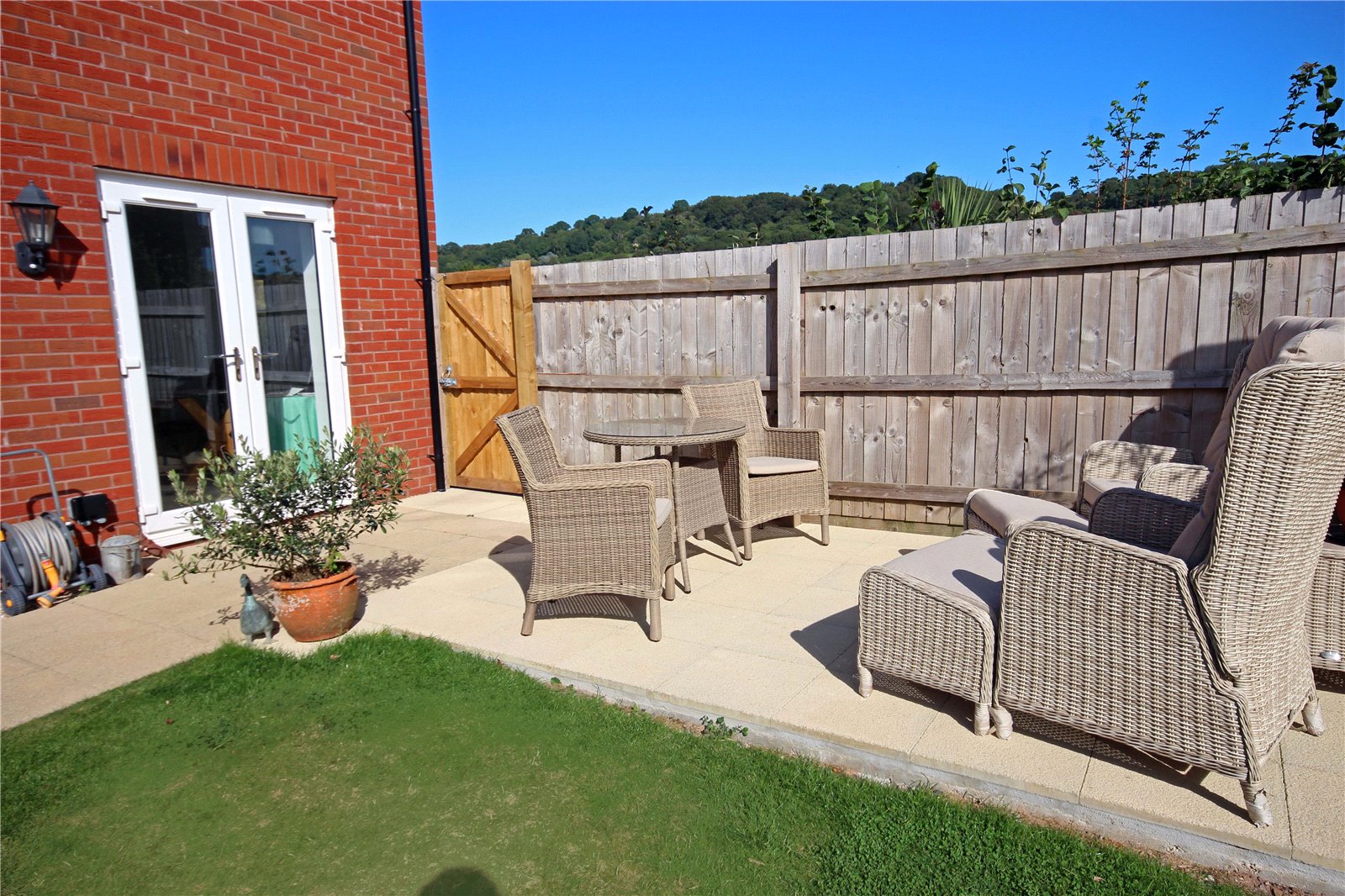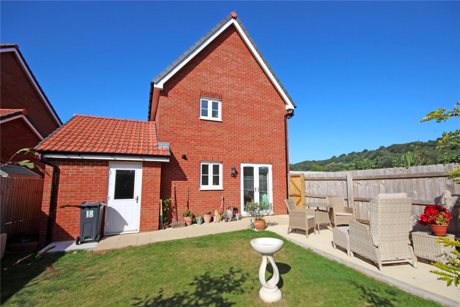 Outside: To the front of the property there is an open plan lawned area with flower and shrub borders with pedestrian gate to the side main garden. A central path leads to the front door and a pathway leads around the other side of the property which has barked garden areas interspersed with plants which link round to the rear of the house. There is driveway parking in front of the attached GARAGE which has an up-and-over door, pedestrian door to the enclosed garden, a pitched roof for additional storage, power and light. The attractive enclosed side garden occupies a south facing position and has a paved seating area immediately to the rear of the kitchen and a lawned area beyond. Due to the position of Number 18, this garden is not particularly overlooked and therefore provides a lovely private space.