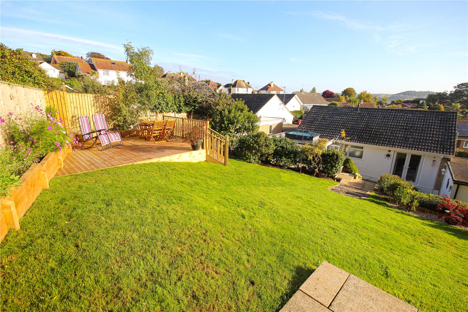 The garden is set over several levels with steps leading up to a raised area of patio above a newly built retaining wall, and then further sleeper style steps rise to the upper garden which is laid to lawn. To one corner is a new decked area with integral wooden planters which makes the most of the impressive views beyond.