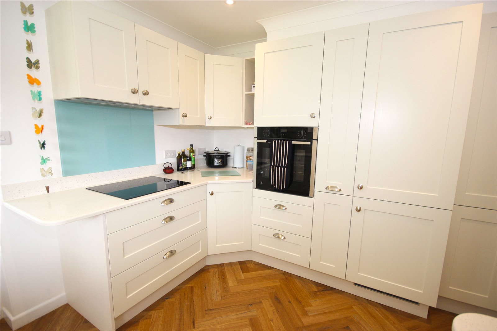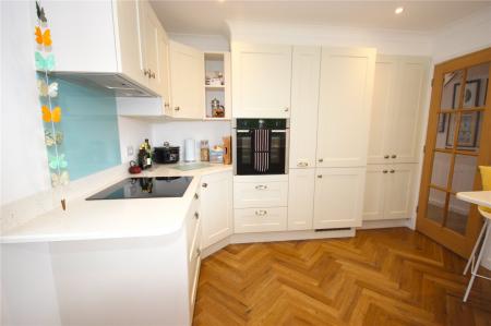 The newly fitted contemporary kitchen has a range of matching cream base and wall units, with Corian style worktops and inset sink alongside a central breakfast bar. The property benefits from integrated Neff appliances including ceramic hob with extractor over, fridge freezer, eye level electric oven and full-sized dishwasher. The gas central heating boiler is also situated in the kitchen.