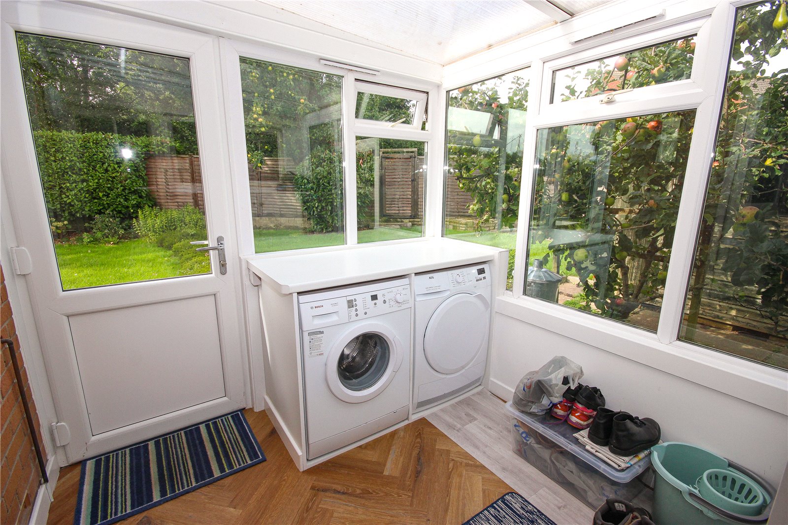 A door from the kitchen opens into a conservatory/utility area with space and plumbing for washing machine and tumble dryer with door to the rear garden and internal door to the attached garage which has up and over door, power and light.