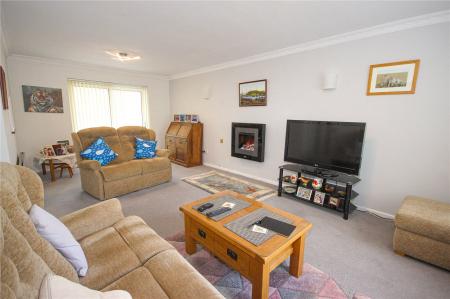 A door opens into the living room which is a well-proportioned room with picture window and central contemporary electric fire. There is a historic A feature-stained glass window looks into the kitchen, whilst sliding patio doors lead from the living room out to the conservatory.