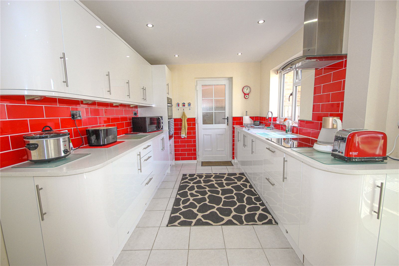 The modern kitchen is fitted with a tiled floor alongside a range of matching white gloss base and wall units, Corian worktops, sink and red subway tiled splashback. There is a ceramic induction hob with extractor over alongside integrated double oven and undercounter fridge. A door leads out from the kitchen to the side garden.