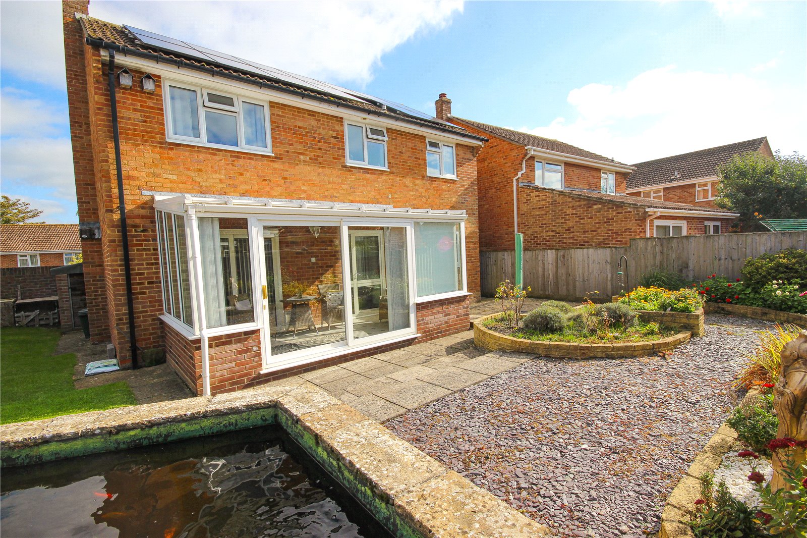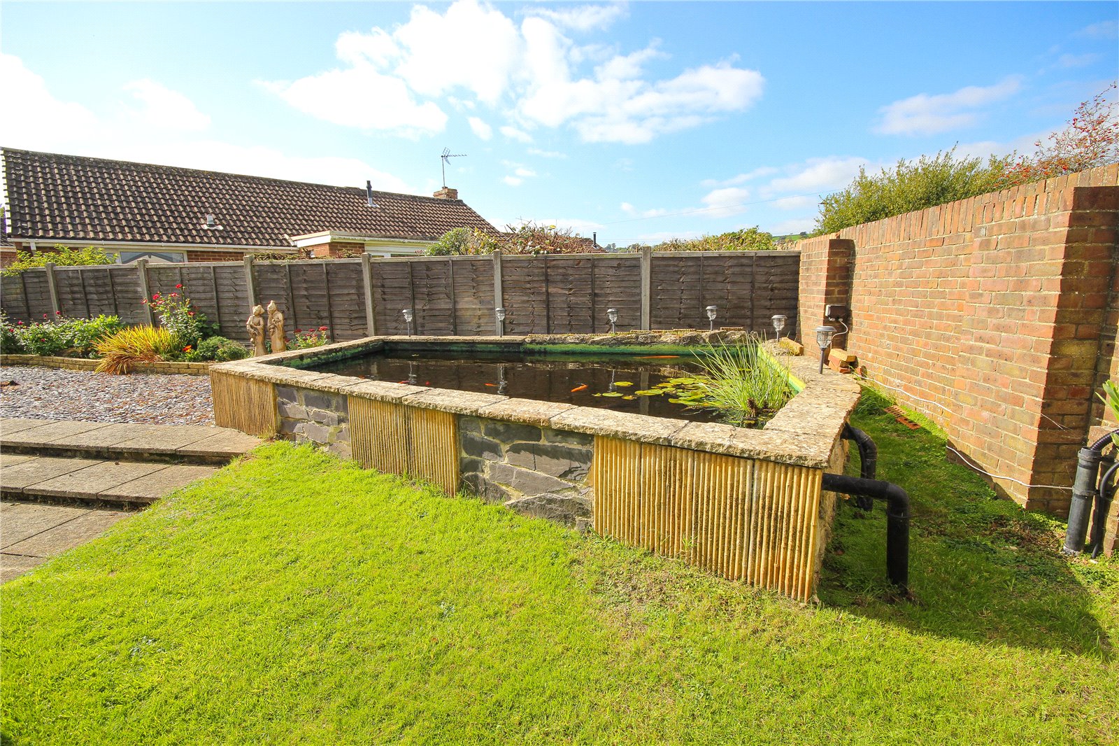 To the rear corner of the garden is also a large, raised brick built well established pond housing a collection of fish and koi carp. There is also an outside tap.