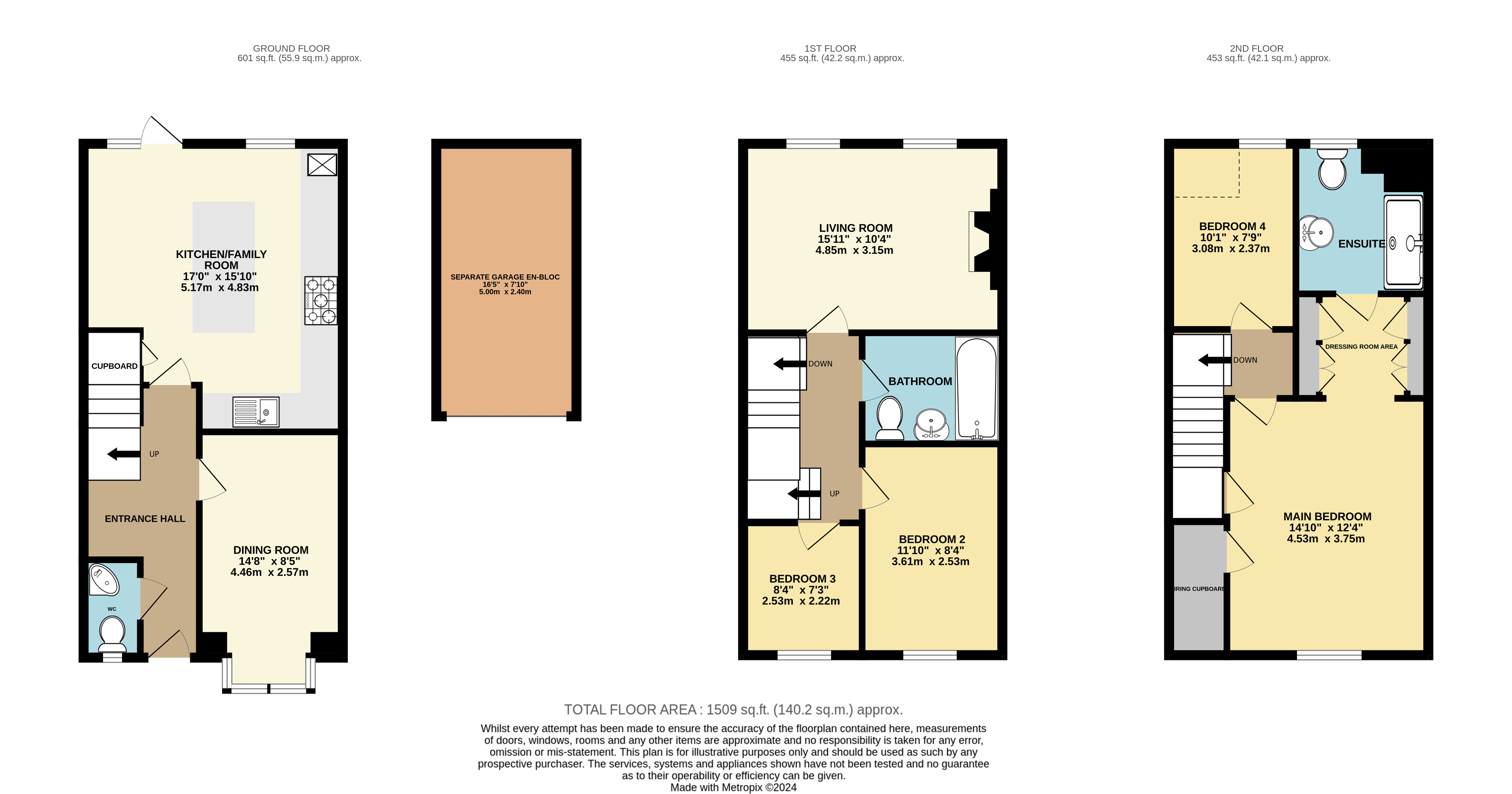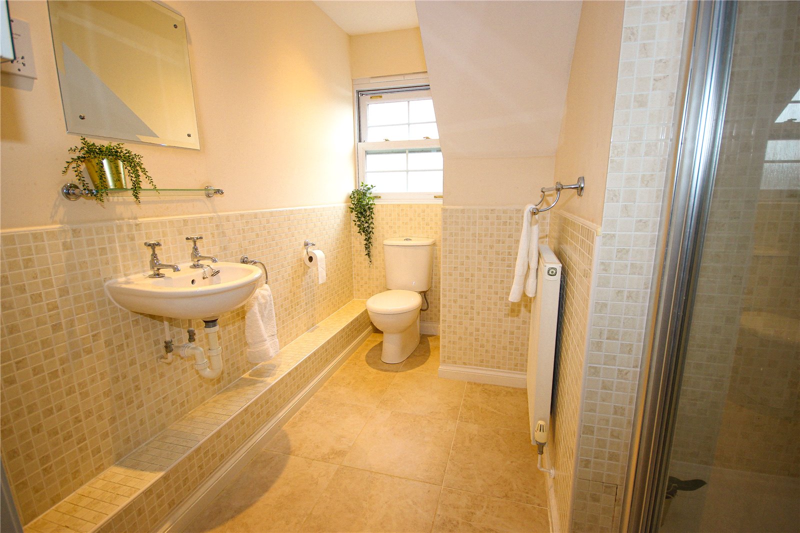 The first floor has a spacious living room with two large windows looking over the rear garden and an electric fireplace with marble effect surround. There is a modern family bathroom with bath with shower mixer taps, sink WC and heated towel rail with part tiled walls and tiled floor. On this level is Bedroom 2 which is a good-sized double room with window looking out to the front of the property and Bedroom 3 a further double with the same aspect. Stairs then rise to the second floor with the remaining accommodation with the smallest bedroom 4, built into the eaves with a window with views to the countryside in the distance. The principal bedroom is a spacious double room with views looking out to the rolling hills in the distance. In addition, there is an airing cupboard housing the hot water tank and an archway leads to a dressing room area with triple wardrobes. A further door then opens to an en-suite shower room with shower, WC and wash hand basin.