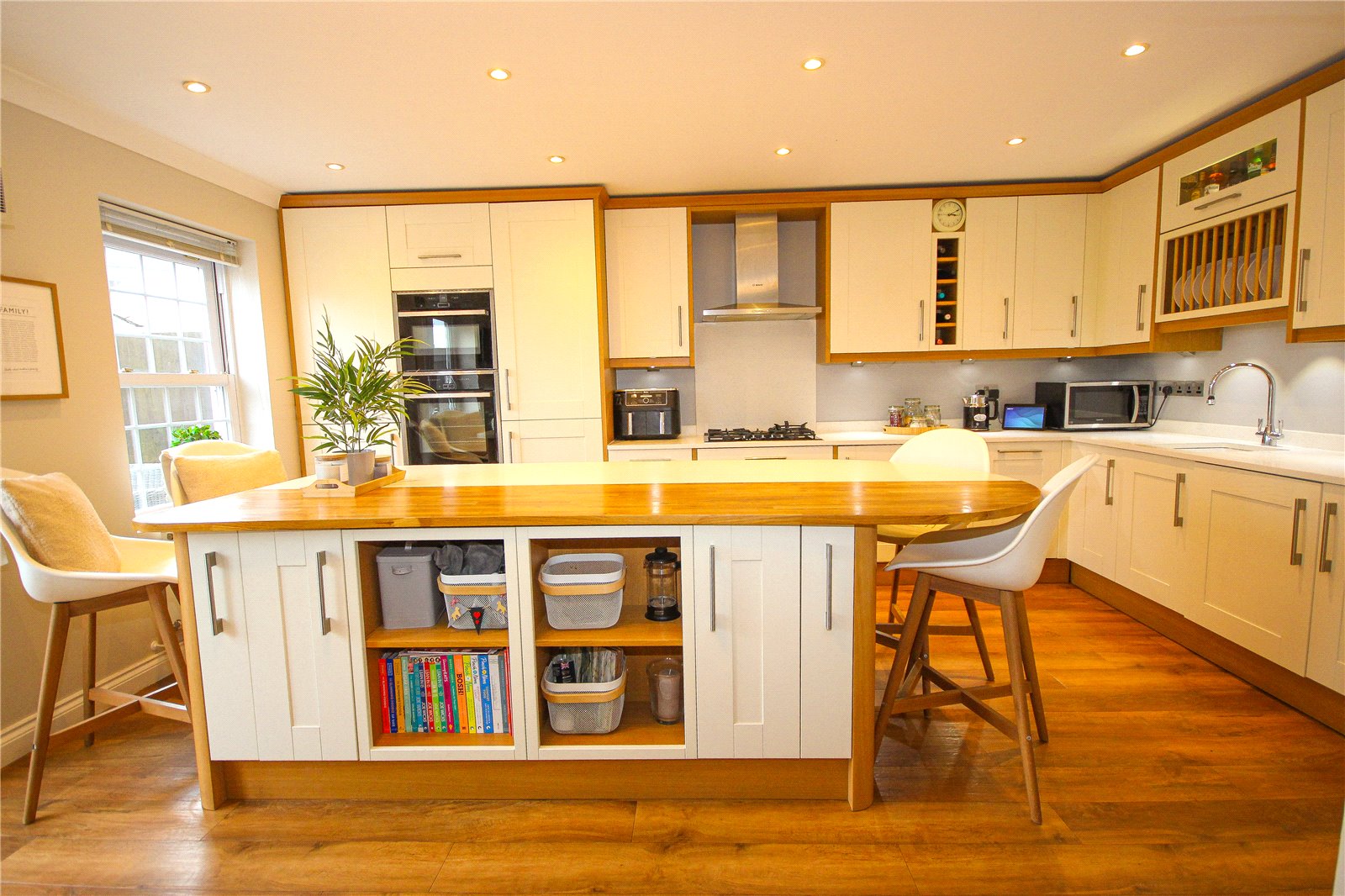 Stone walling with an entrance with pillars either side, give access to a paved pathway leading a front patio area and to the front door with storm porch overhead. The front door opens directly into the hallway with a WC to the left hand side and opens stairs then rise and turn to the first floor, whilst a door to the right hand side opens to a dining room which benefits from a large bay window. Karndean wood effect flooring flows through the majority of the downstairs with the kitchen/family room at the rear of the property with French doors opening out to the rear garden. The kitchen has a matching range of cream shaker style, base and wall units with an integrated Neff double oven with five ring gas hob with extractor fan overhead. In addition, there is a large kitchen island with additional storage below with a 50/50 design to the worktop which is split with part wooden and part quartz worktop to match the rest of the kitchen. The kitchen is well equipped with an integrated washing machine and slim-line dishwasher, undercounter lights, soft closing drawers, plate rack and an undermounted Belfast style sink. There is also an additional storage cupboard and plenty of space for a sofa.