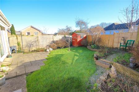 The rear south facing garden is bordered by wooden fencing and is mainly laid to lawn with raised walled beds and attractive planting, alongside a rear seating area and patio space. There are two wooden sheds and an outside tap.