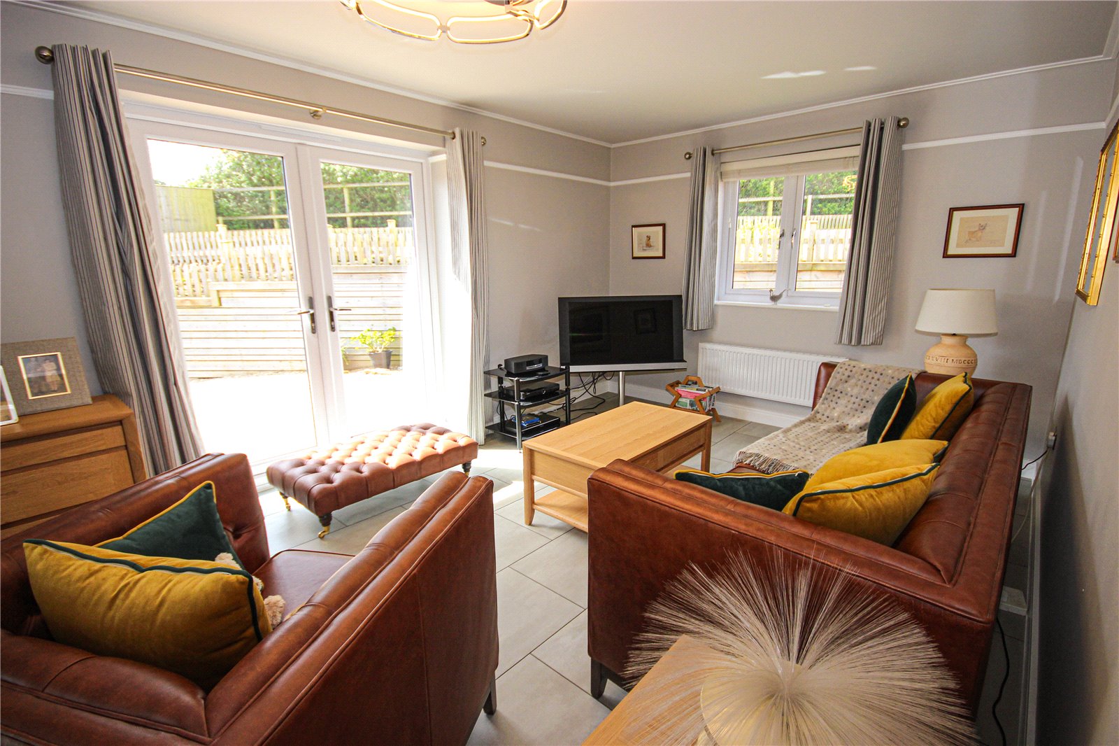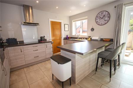 A composite front door opens to the entrance hall with door opening to deep storage cupboard and access hatch to loft. High quality Karndean large tile effect flooring flows through the entrance hall and majority of the living space. A door from the hallway opens to a large double aspect living room with French doors opening to a patio to the rear of the property and overlooking the gardens. Glazed twin doors give separation from the kitchen/dining area or open fully giving the feel of a large full open plan living/kitchen/dining space. The open plan kitchen/dining room has French doors opening out to the patio for al fresco eating and overlooks the garden. The kitchen is beautifully fitted with a matching range of base and wall units with soft closing doors and drawers, grey laminate worktops with inset sink and incorporates a breakfast bar and integrated appliances including a built-in electric oven, electric hob with extractor fan over with fridge, freezer, integral dishwasher and inset spots to ceiling. A door then opens to a utility room, with matching units to kitchen, with cupboard housing, an Ideal Logic gas central heating combination boiler, space for washing machine, inset sink and a door to rear. There are three bedrooms and the main bedroom has a range of fitted wardrobes, matching dressing table and bedside units alongside an en-suite good-sized shower room with fully tiled walls. Bedroom 3 also has a large built-in wardrobe. The family bathroom is well equipped with a white suite comprising a panelled bath with central taps, an overhead shower, WC, wash hand basin and fully tiled walls.