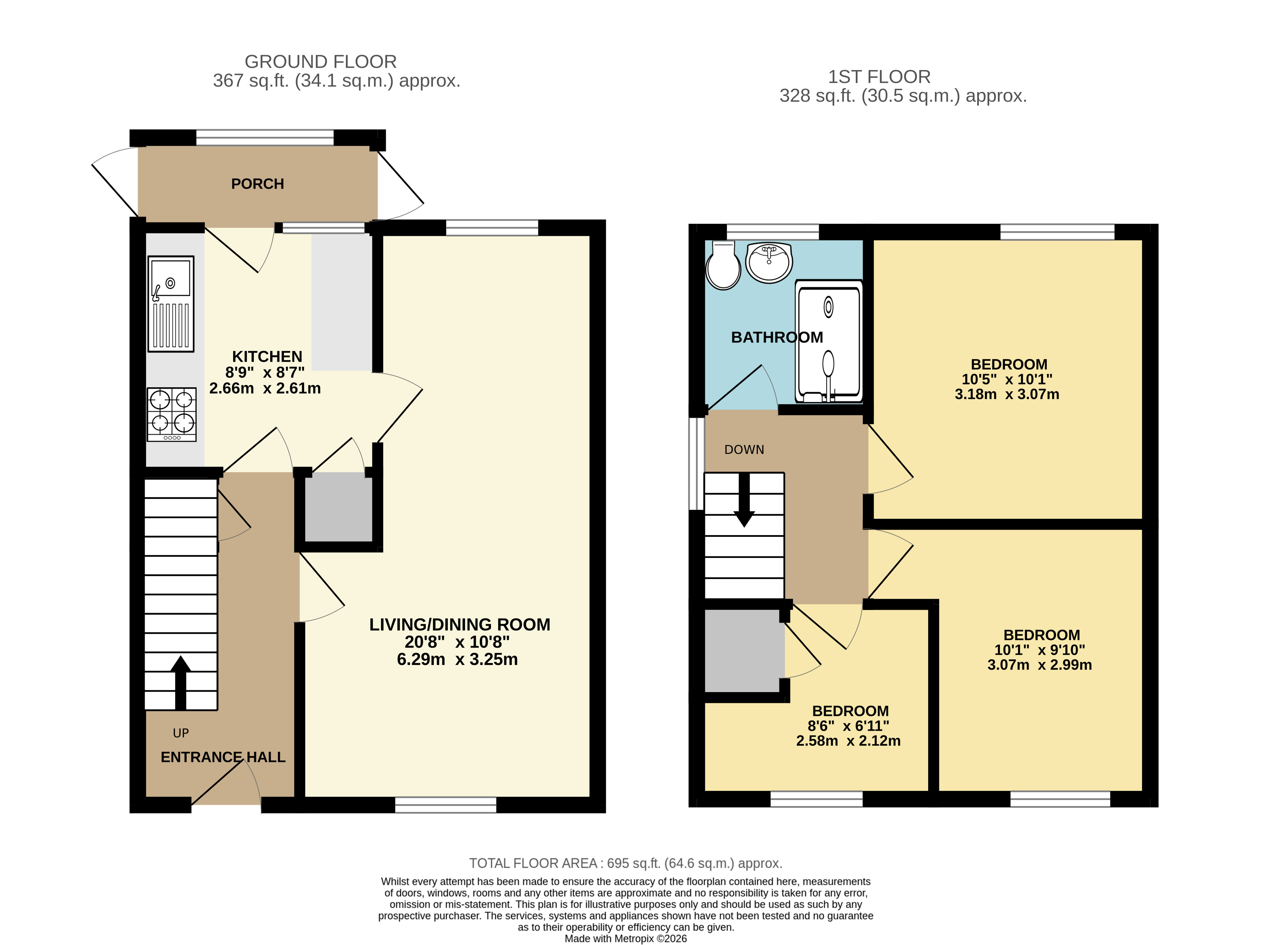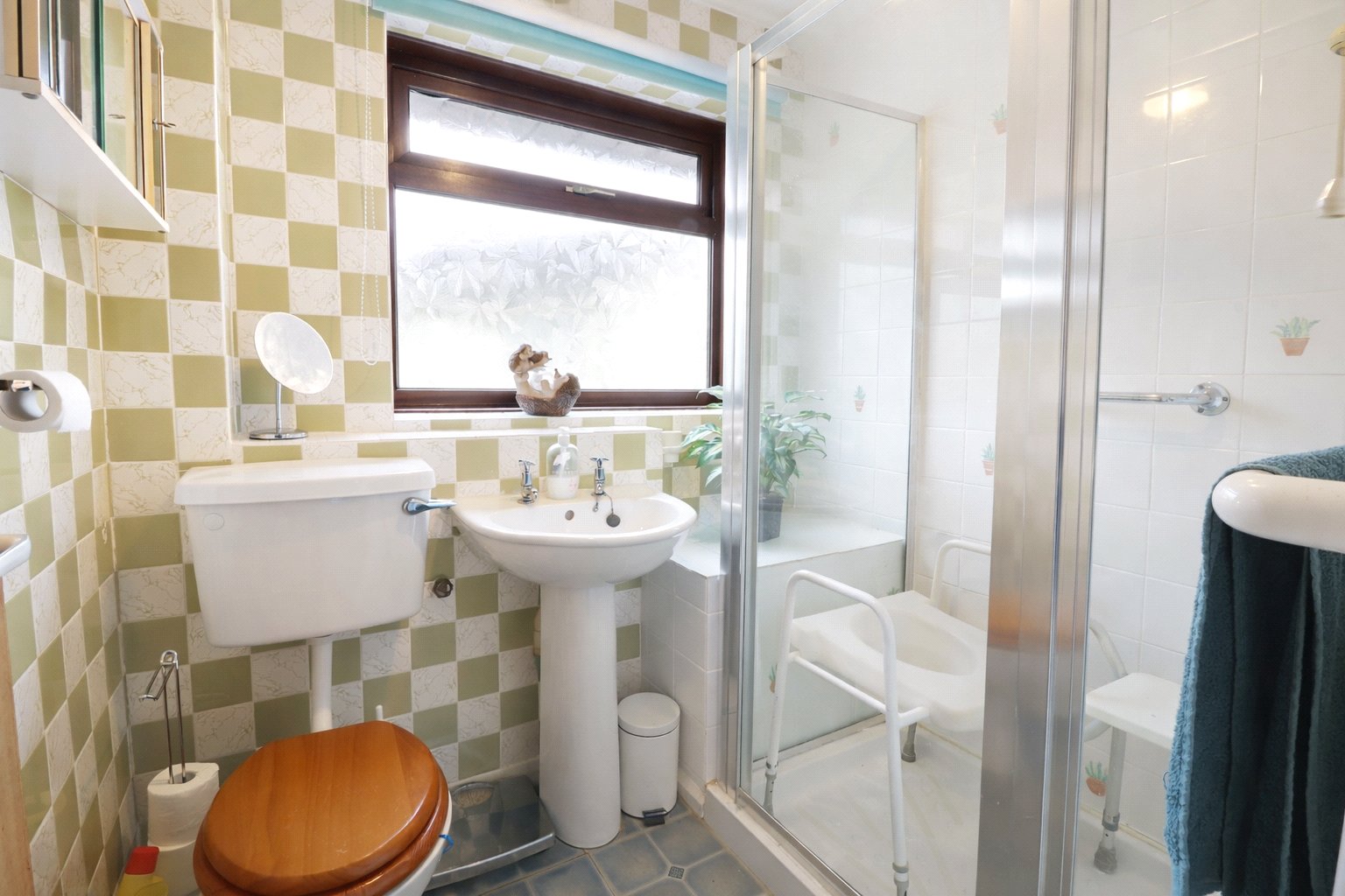 Upstairs, the first floor provides three bedrooms and a bathroom. The principal and second bedrooms are both comfortable rooms, while the third bedroom offers flexibility for a child’s room, study or occasional guest space. The bathroom is arranged with a white suite and includes a shower area.