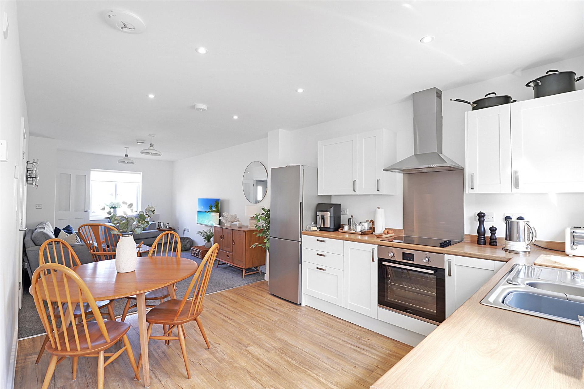The accommodation is arranged over two floors and benefits from uPVC double glazing and underfloor heating fired by an air source heat pump. The entrance hall has the stairs to the first floor. There is a good sized lounge at the front of the house and at the rear there is a spacious kitchen/diner area which has a bright and airy feel. Countryside views can be enjoyed from lounge out towards the front elevation. The kitchen and lounge areas flow well in to one another, with the whole space being open plan. The kitchen is fitted with modern base and wall units and includes an integrated oven, hob and extractor. There is space for a fridge freezer, washing matching/ dishwasher. A door at the rear of the kitchen leads out onto the rear garden. There is also ground floor cloakroom/wc.