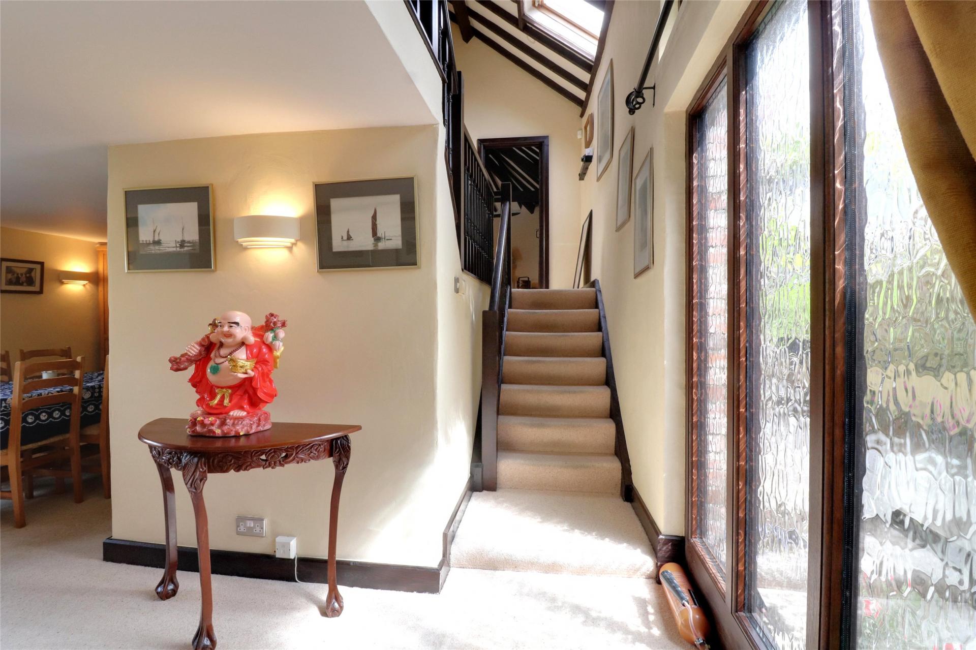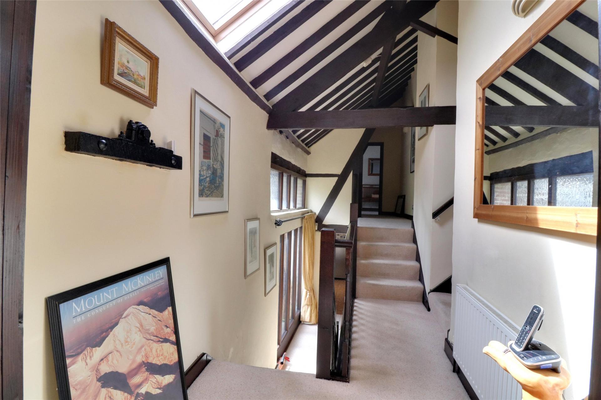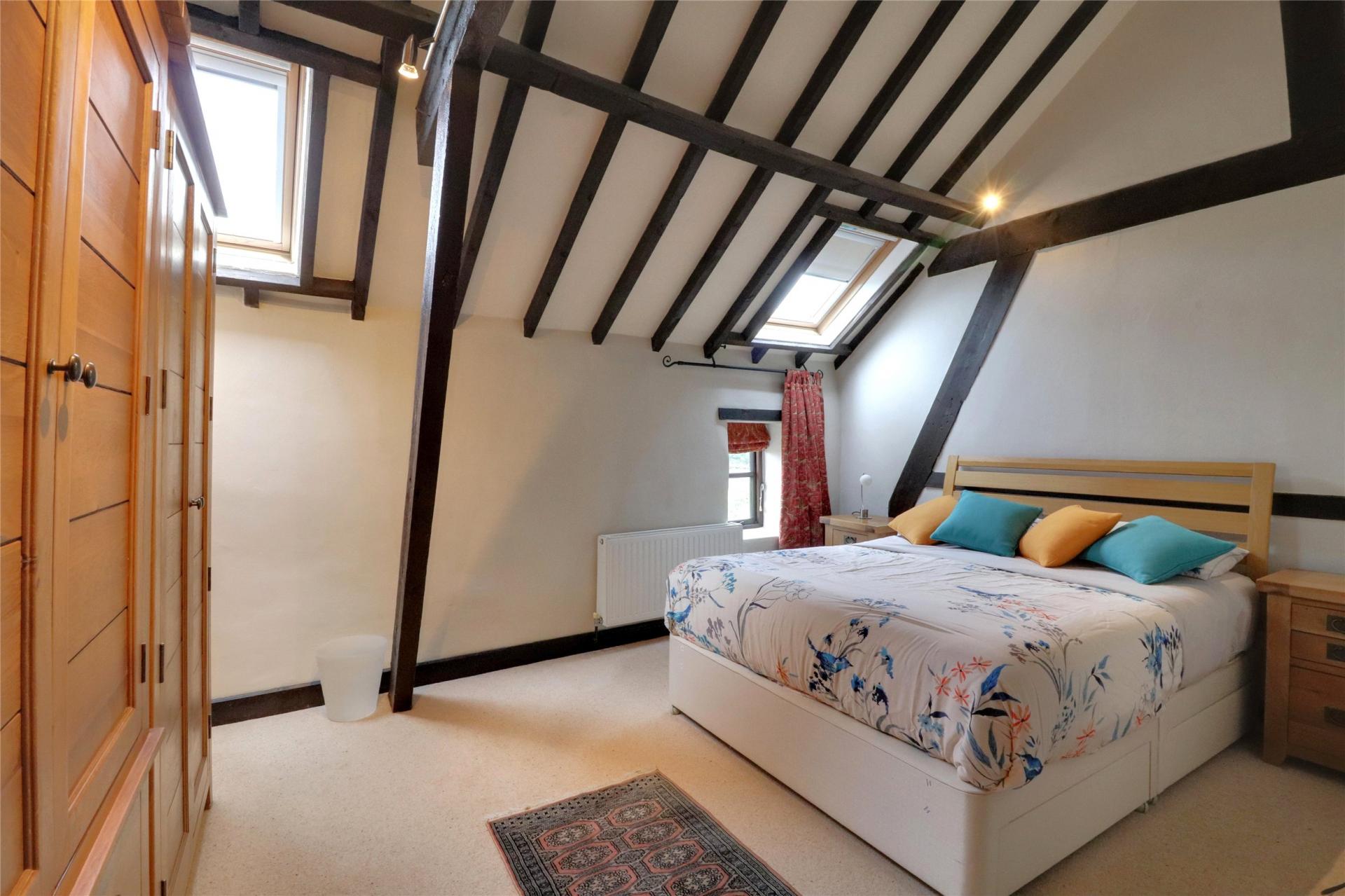From here, double access leads you into the formal dining room, which is a generous space enhanced by a large storage cupboard and the first glimpse of the stunning vaulted ceilings and original exposed beams that run throughout the upper floor.