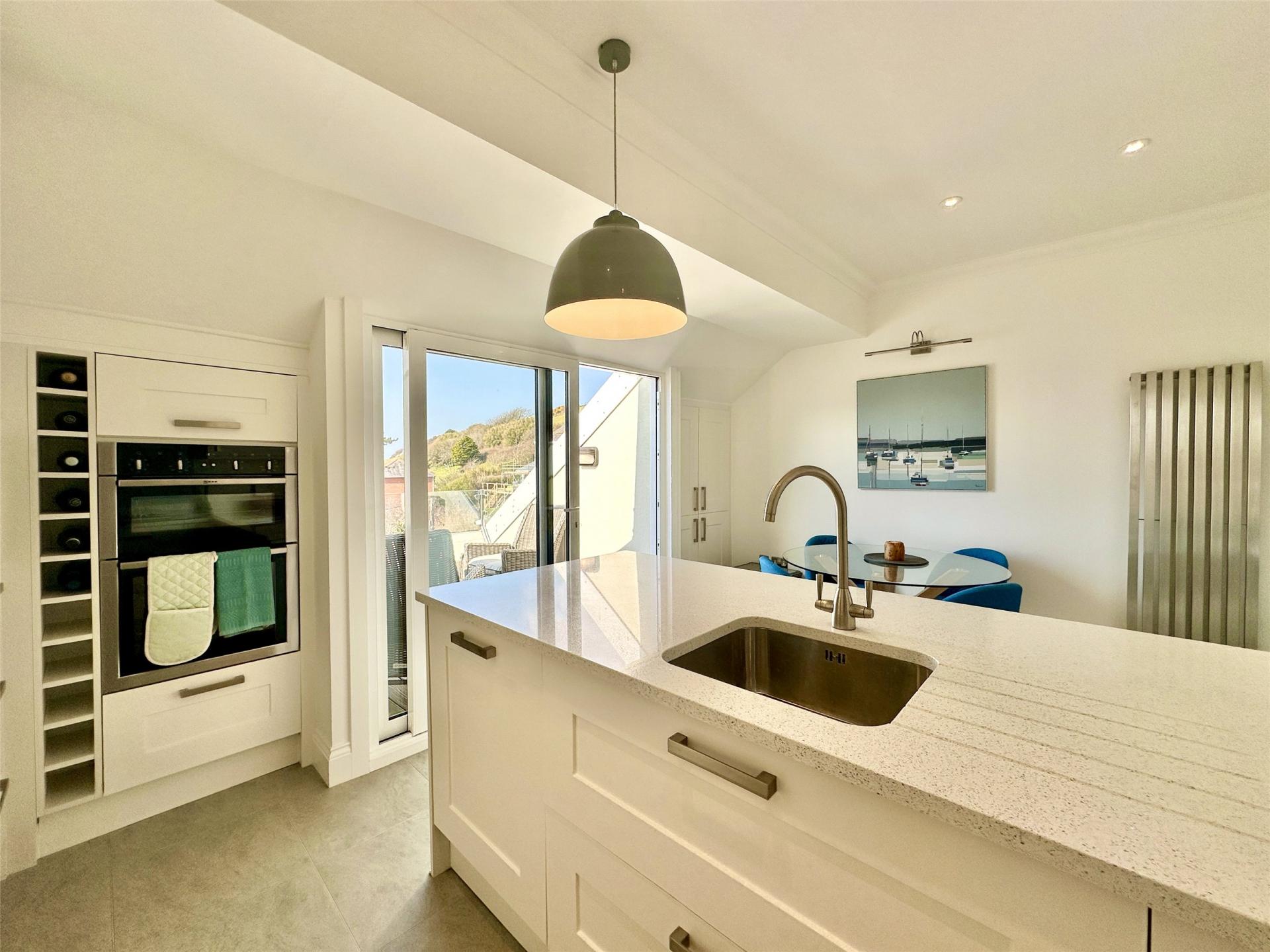 The kitchen and dining room is equally well suited to modern living, offering a sociable and well planned space for everyday use as well as entertaining. It is fitted with a range of integrated appliances and includes a breakfast bar for informal dining, with ample room for a dining table. Sliding glazed doors open onto a private inset roof terrace, creating an exceptional outdoor extension of the living space and a wonderful place for dining outside, relaxing in the sun or simply enjoying the sunsets across the bay.