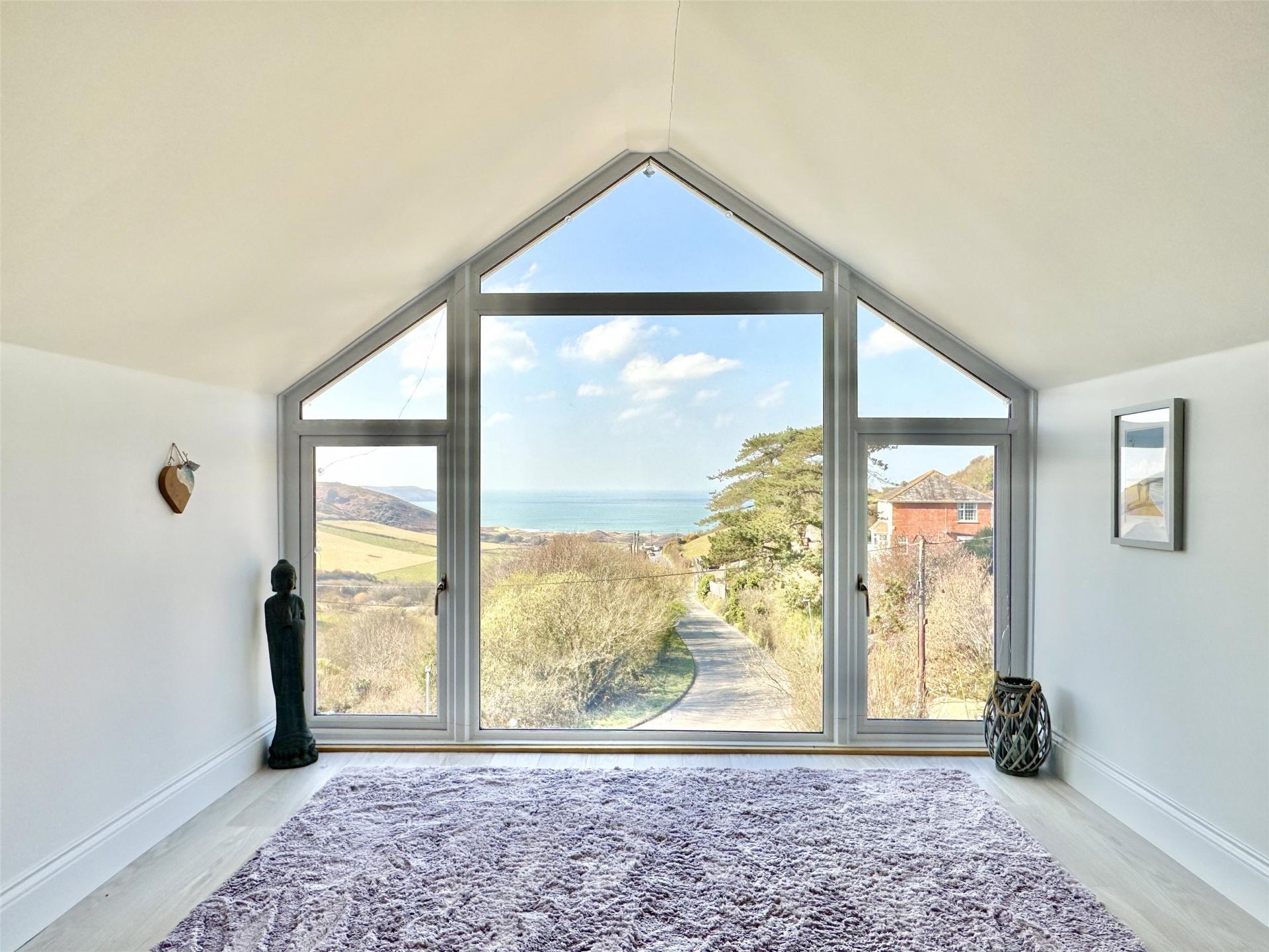 The lounge is a particularly striking room, extending to around 20 feet and centred around a dramatic vaulted ceiling rising to approximately 12 feet. A full glazed gable end draws the eye straight to the remarkable view, taking in the valley, surrounding countryside, the village itself and the sweep of Woolacombe Bay beyond. From here there are far reaching views towards Baggy Point, Hartland Point and Lundy Island, giving the room a memorable outlook that changes beautifully with the light and seasons.