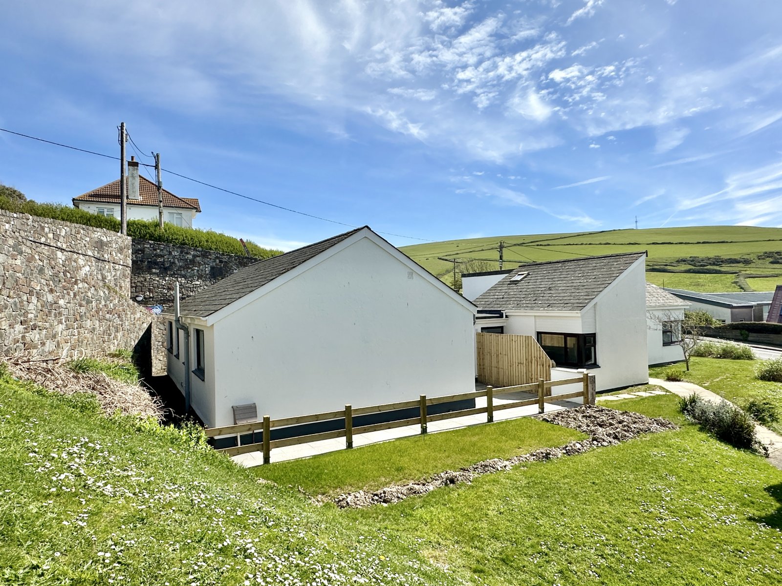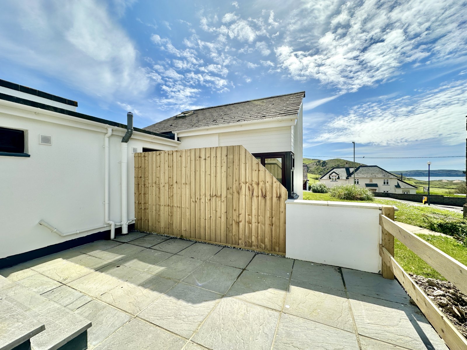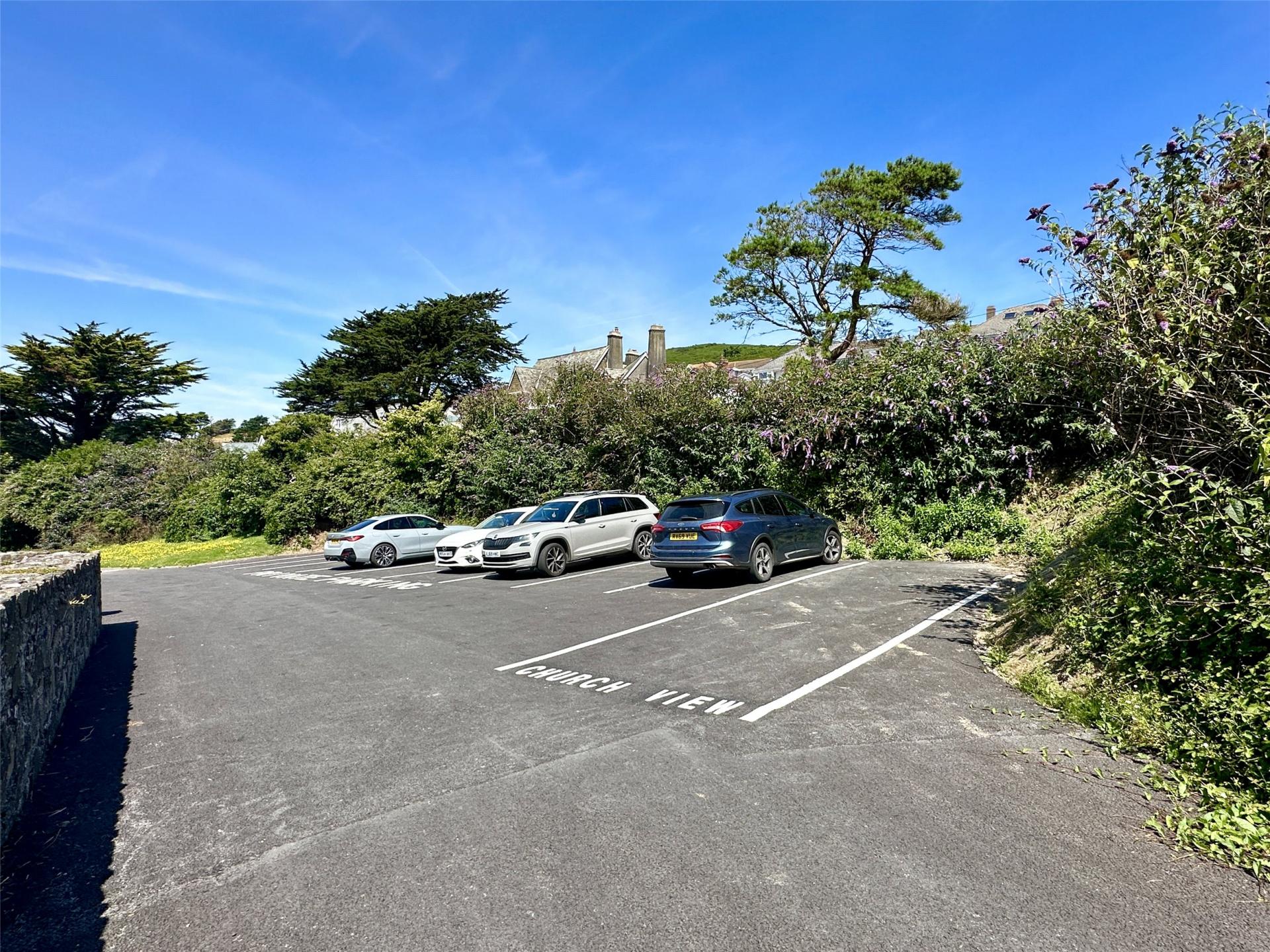 Outside, there are two allocated parking spaces in the car park at the rear of the building. A sloped walk-way leads down from the car park to the entrance to the building. There is also a further pedestrian access from the front from Beach Road as well. The delightful, south facing, low maintenance garden comprises a paved patio which is directly accessible from the main living room blending indoor and outdoor living seamlessly. The patio offers good space for outdoor furniture and sun loungers and is a great spot for an al-fresco meal or a barbecue. The patio wraps around to the side of the building and to the rear. There are views from the garden over the village with glimpses towards the sea and Baggy Point.