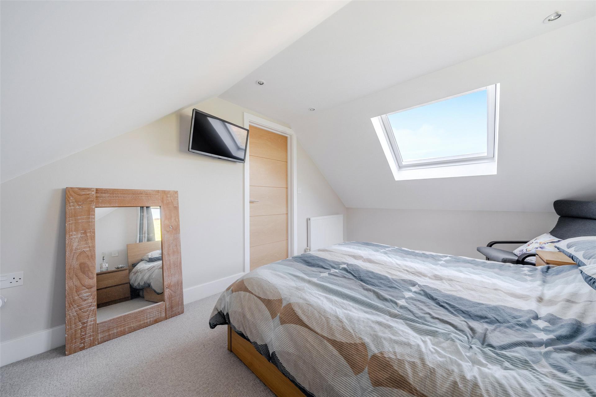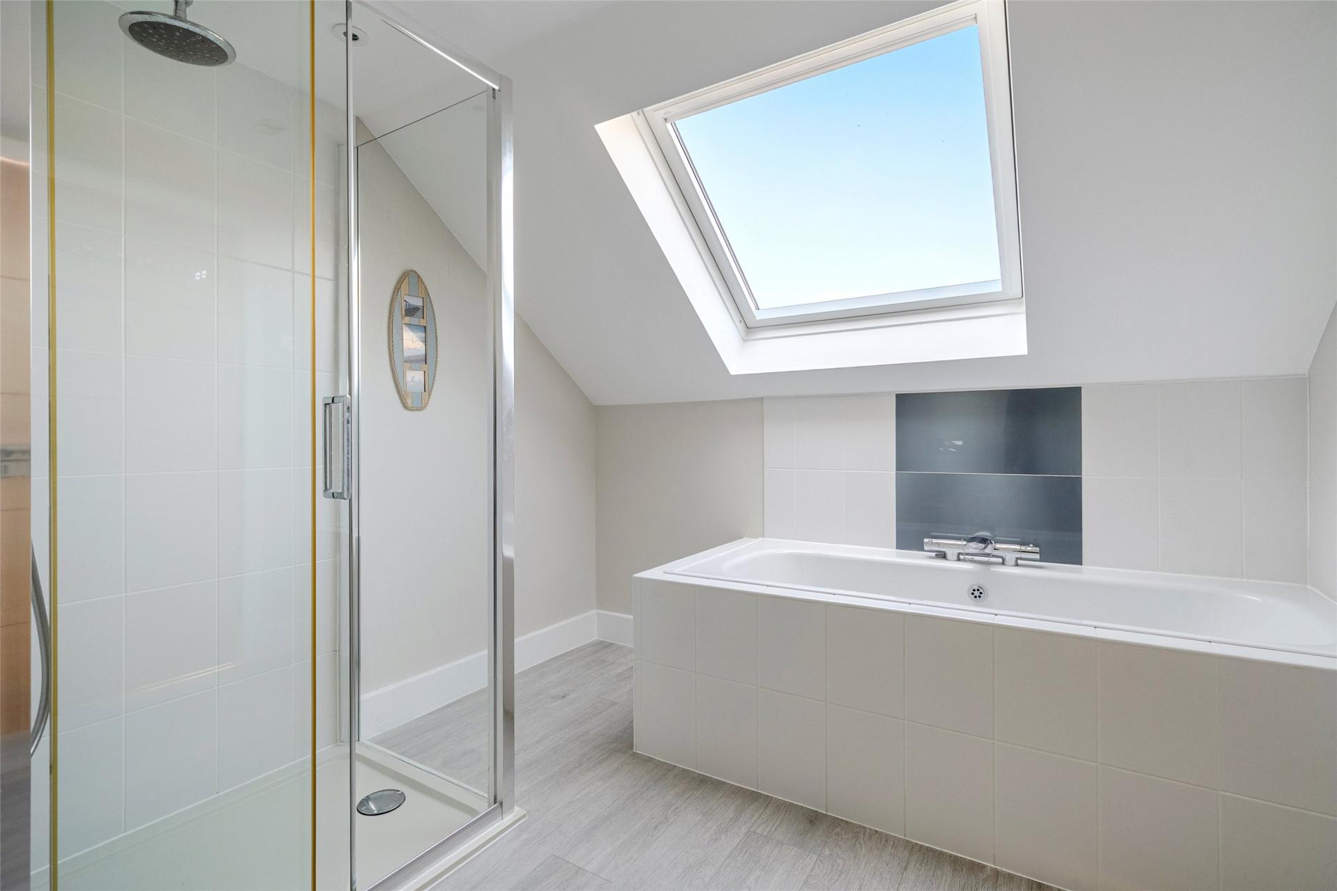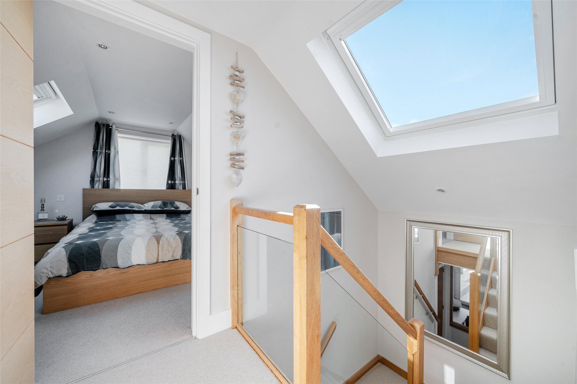 Moving to the first floor, a large velux style window allows plenty of light to pour on to the landing which also has three deep built in store cupboards. The master bedroom is another bright and airy room with delightful views over the National Trust Land at the rear as well as towards the sea from the large velux style windows on either side. Across the landing is a spacious and well fitted bathroom which has a large bath, separate walk in shower cubicle with raindrop head shower and additional shower wand, a low level wc with a concealed cistern and a hand basin set in a modern vanity unit with cupboard under, mirror, vanity light and shaver socket over.