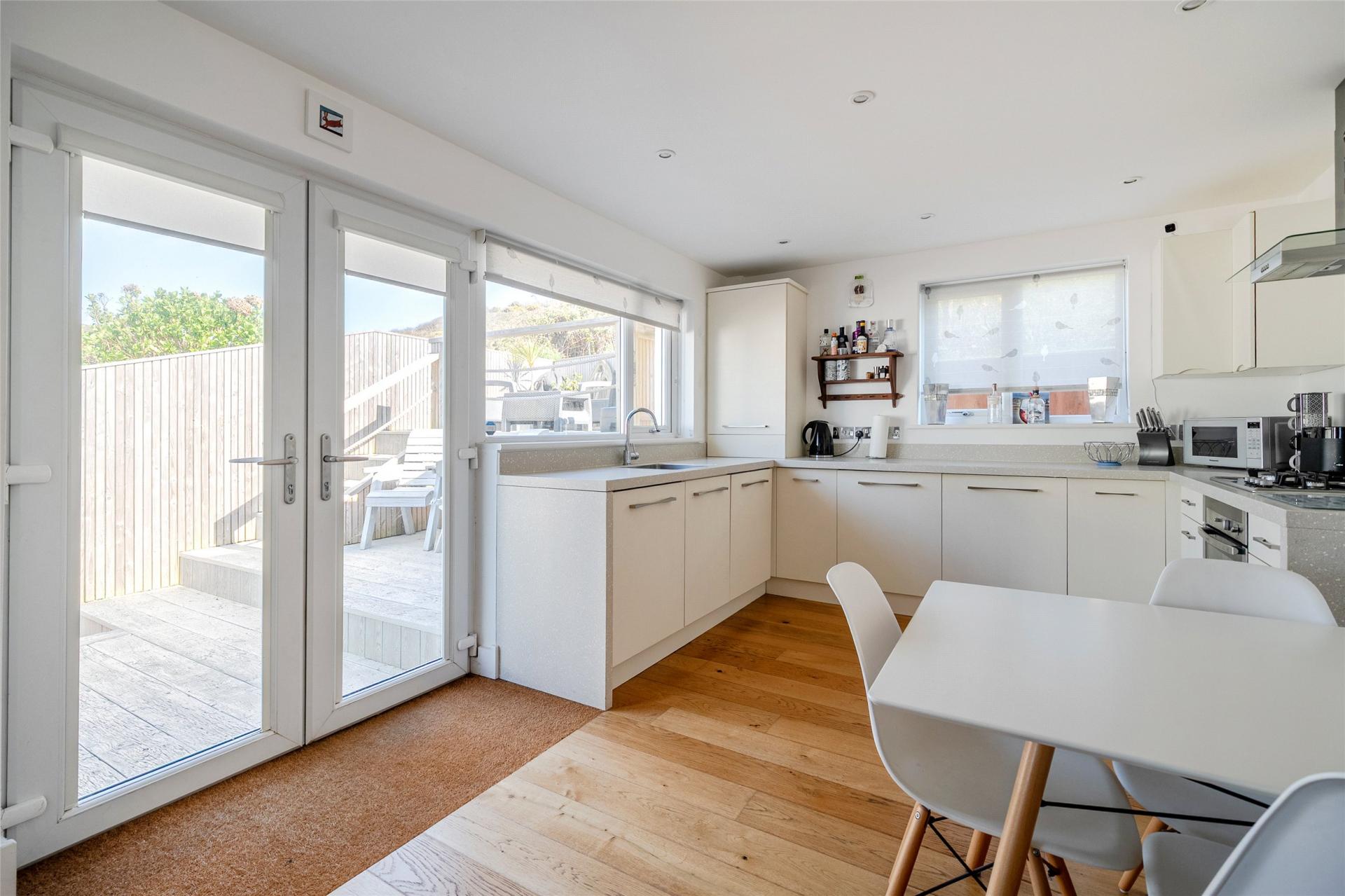 Beach View is located at the end of a no-through road, yet is only a stone’s throw from the beach and village amenities. There is a footpath to the side of the property which takes you down to the beaches and along to the restaurants and shops. Beach View also offers a high degree of privacy and backs onto National Trust Land.