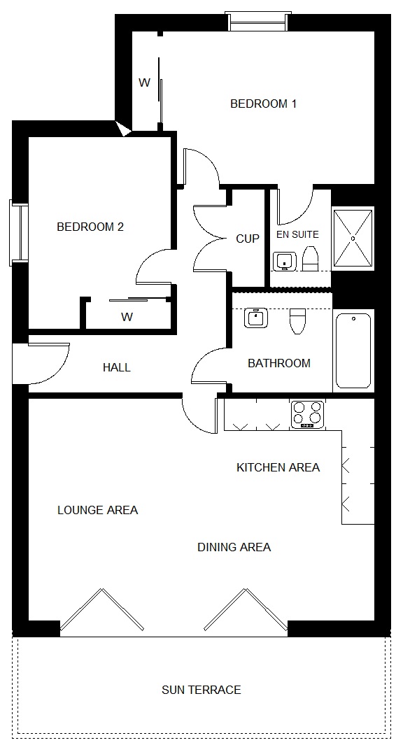 The spacious accommodation comprises 2 bedrooms and 2 bathrooms and a 21ft x 14ft bright and airy open plan living/dining/kitchen area which has virtually the whole of the front elevation devoted to full height glazing and bi-folding doors that open onto the sun terrace. The kitchen is equipped with a range of integrated appliances which include a double oven with an electric hob and extractor canopy over, a fridge/freezer and dishwasher. Within the hallway there is a useful store cupboard which also houses the hot water cylinder and the washer/dryer. There are two good sized bedrooms. Bedroom 1 is a double room with its own en suite shower room and bedroom two is set up as a twin bedded room but with the option to be used as a double room as and when required. Along the hallway is the family bathroom and, as with the en suite, there is attractive tiling and modern white fittings. There is an allocated parking space for the apartment in the large underground car park and a useful storage box ideal for beach equipment etc.