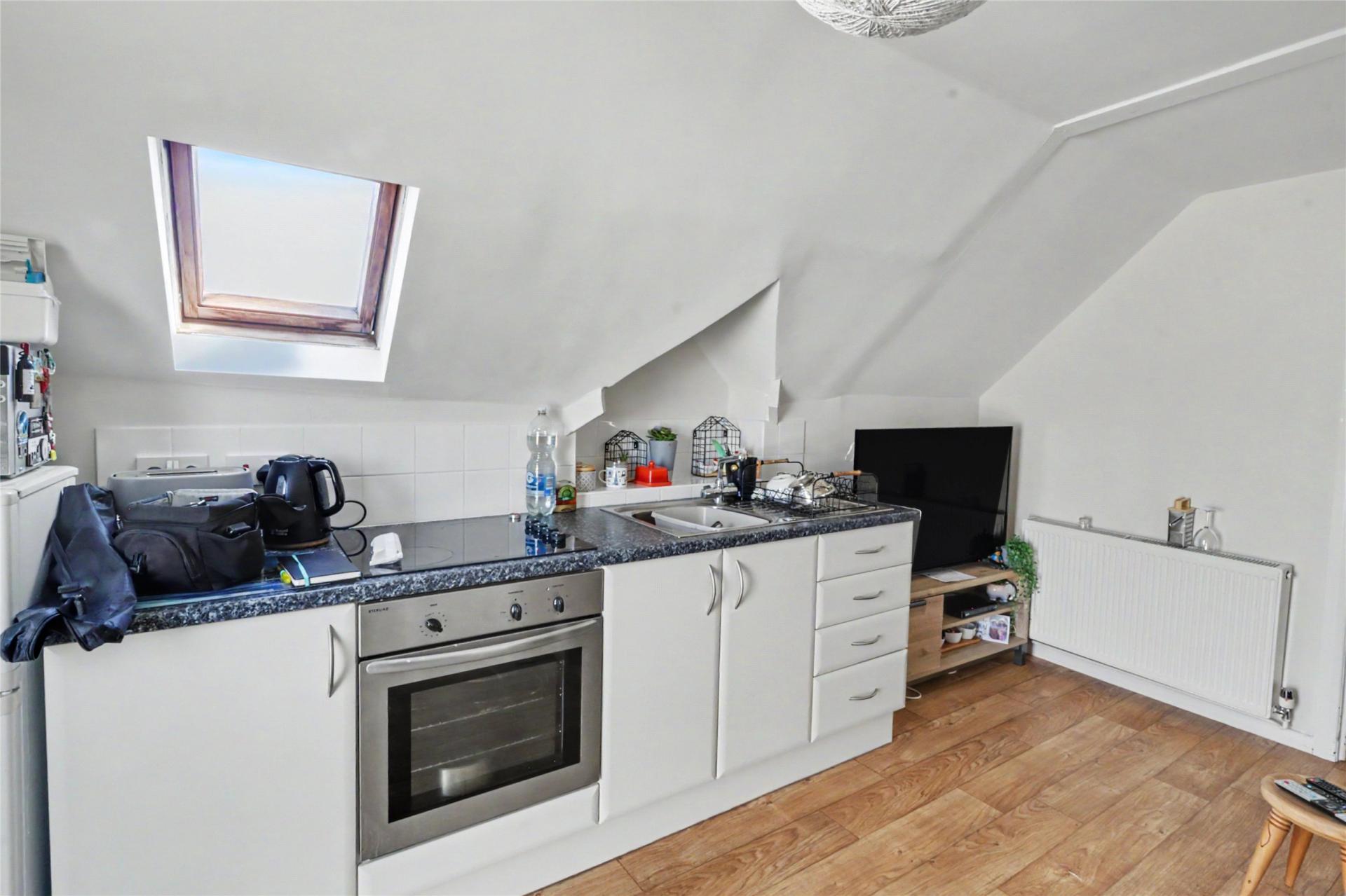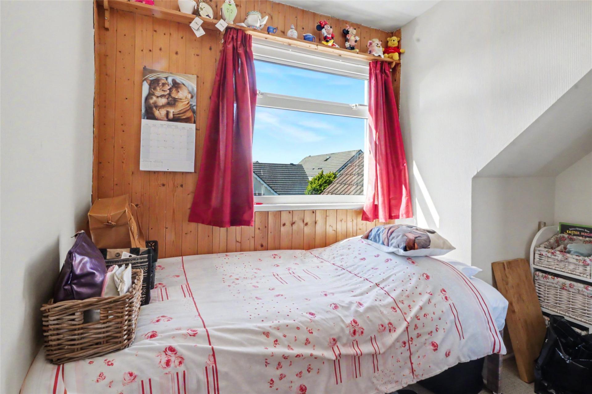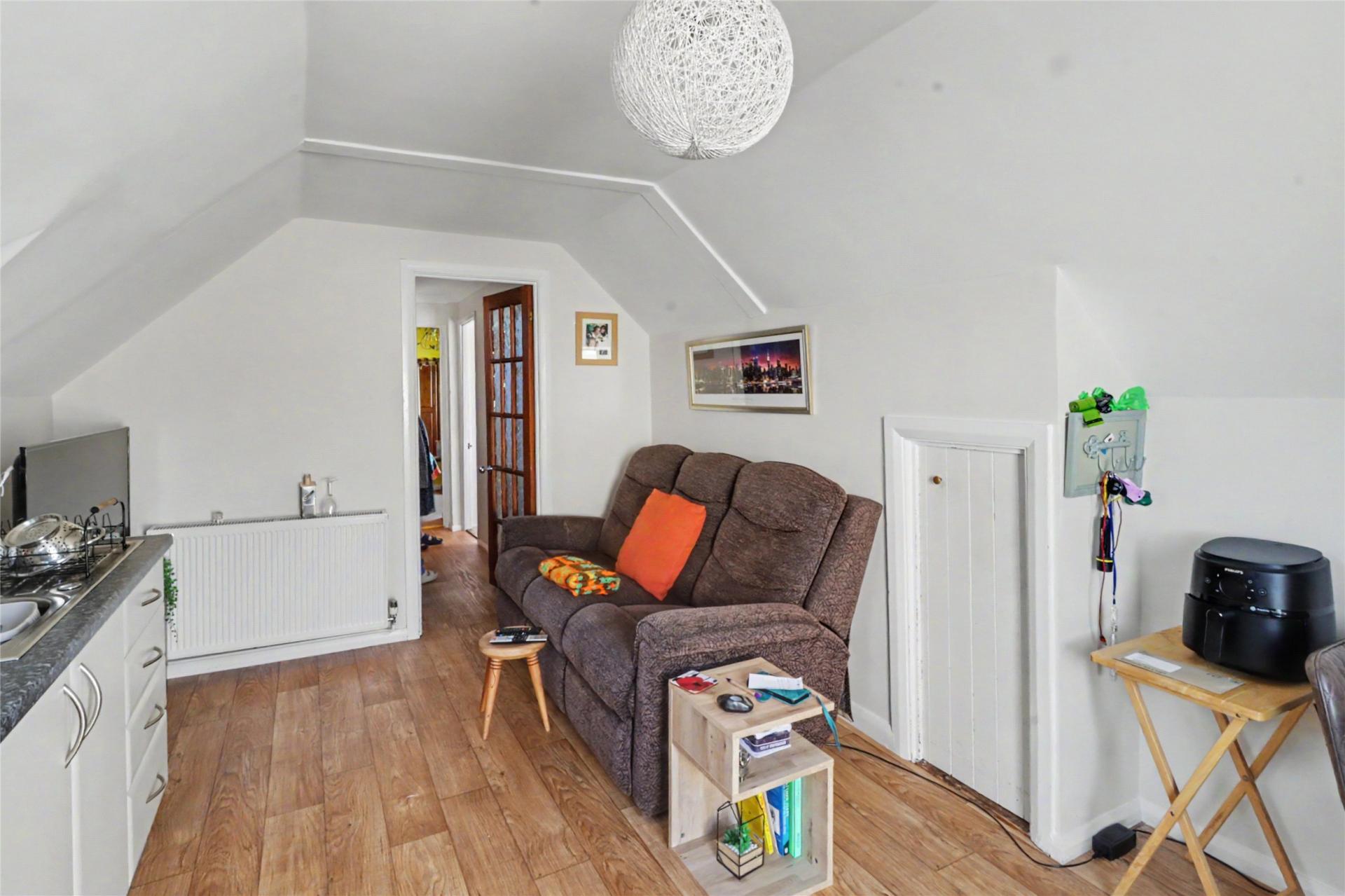 A separate external staircase to the side of the property rises to a first floor sun deck and the entrance to the self contained flat. Inside, the accommodation is arranged around an open plan lounge kitchen diner, creating a sociable main living space. The kitchen includes undercounter storage, a stainless steel sink with drainer, and a built in electric hob and cooker. There is also access to generous eaves storage, which benefits from a Velux style window bringing in natural light. The flat continues with a shower room, a smaller front facing bedroom with pleasant outlook, and a main front facing bedroom at the end of the hall.