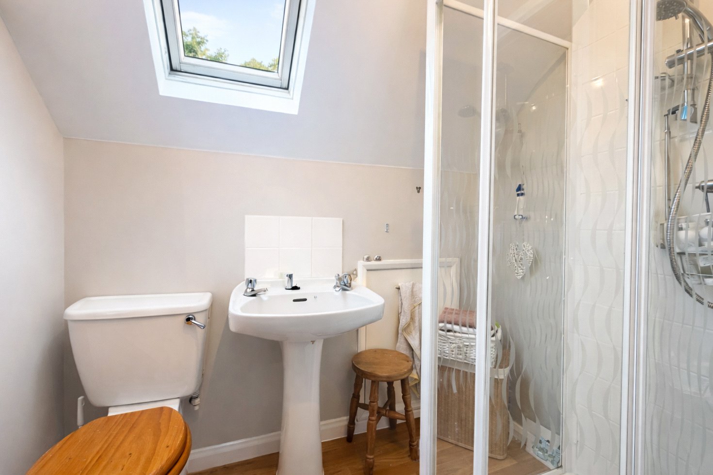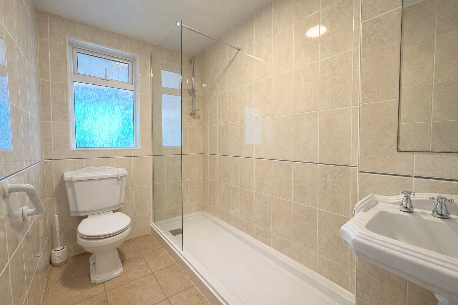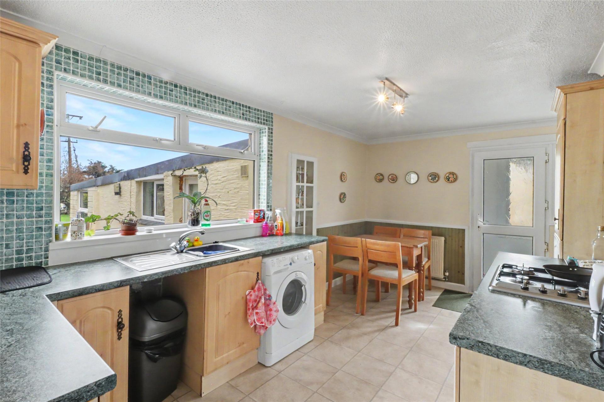 To the rear, the kitchen breakfast room enjoys a pleasant outlook over the garden and provides direct access out to the driveway, making it especially practical for day to day use. It is fitted with a range of cupboards, a stainless steel sink with drainer, a built in four ring gas hob and cooker, together with undercounter space for white goods. The main bathroom is finished in neutral tiling and fitted with a toilet, sink and large shower.